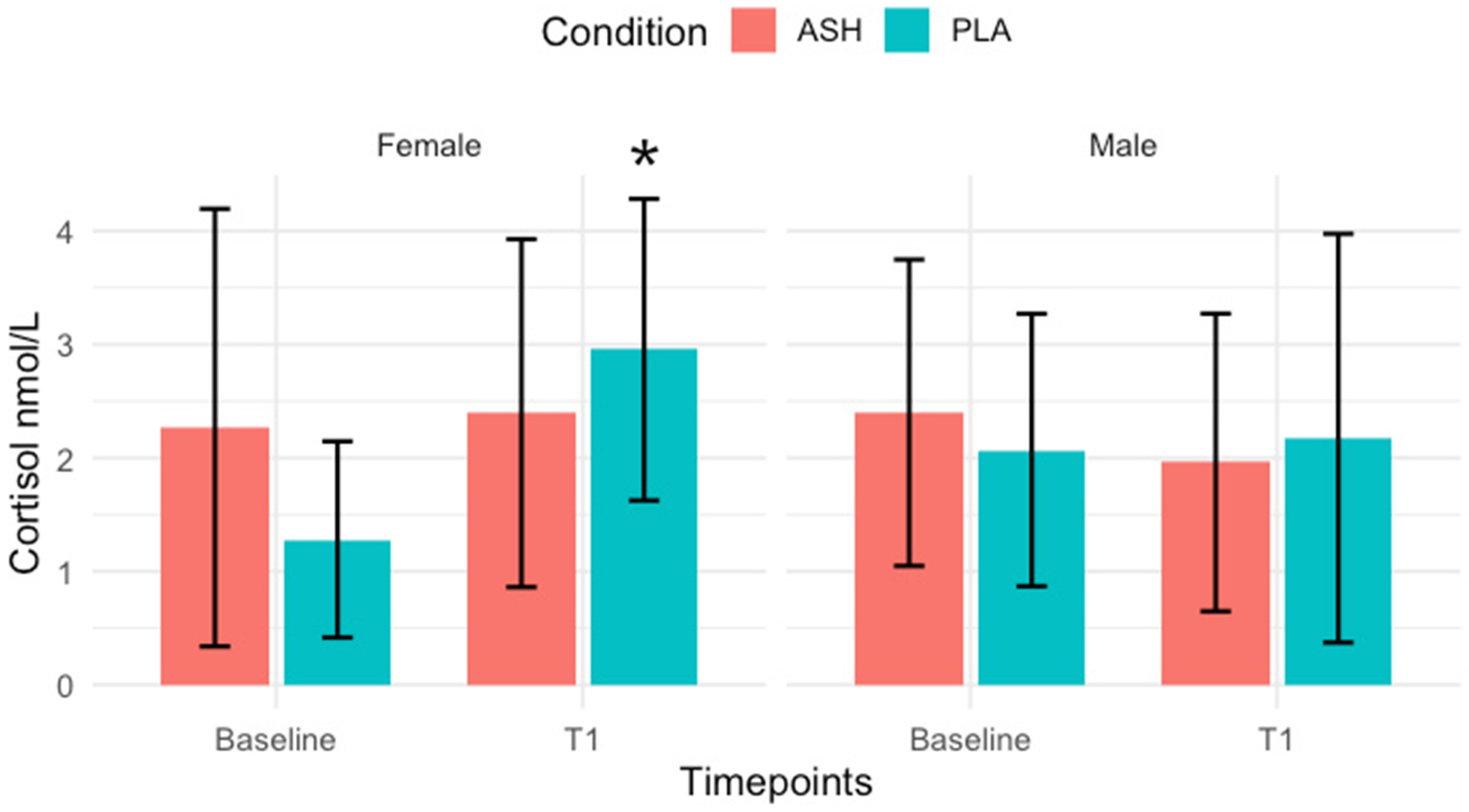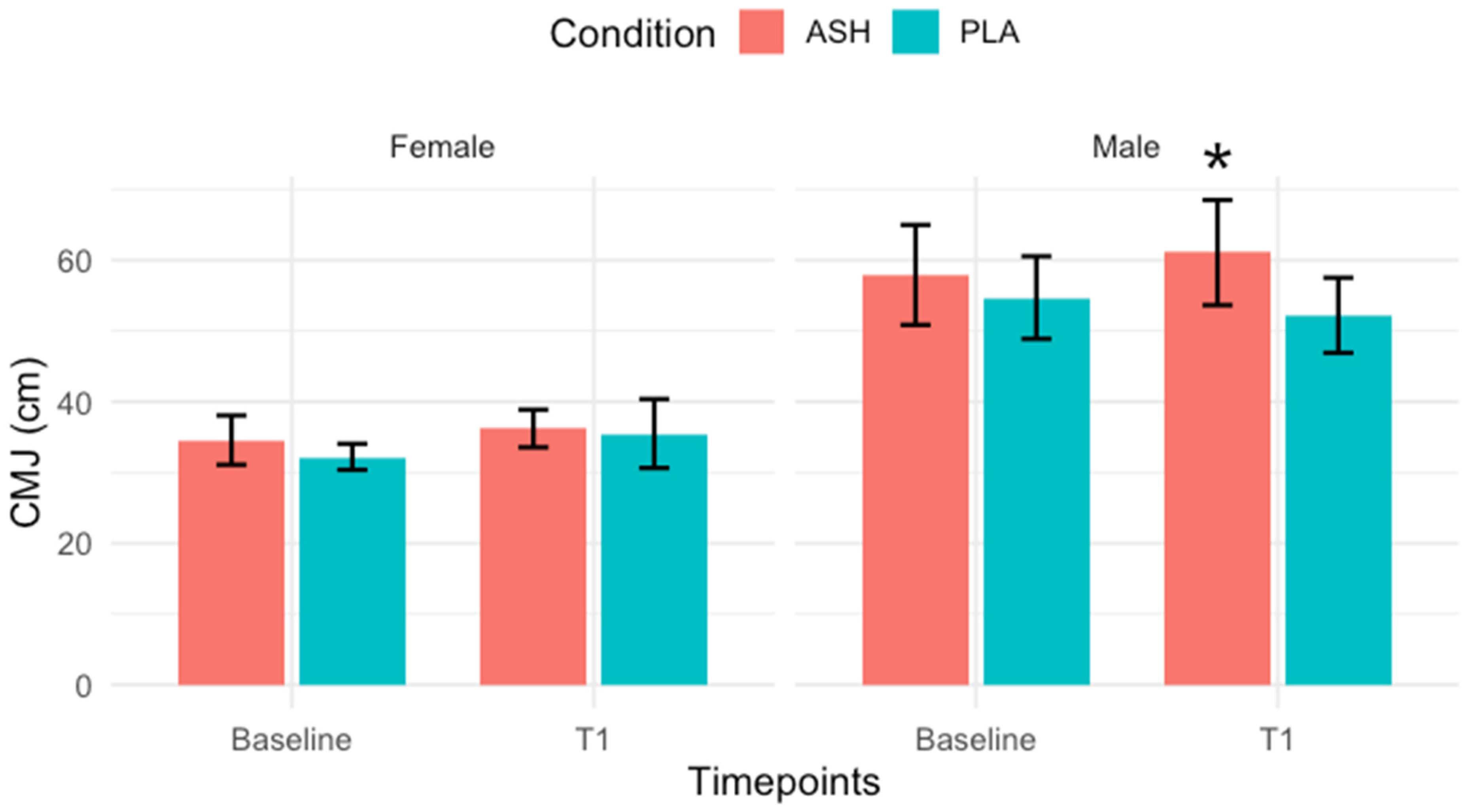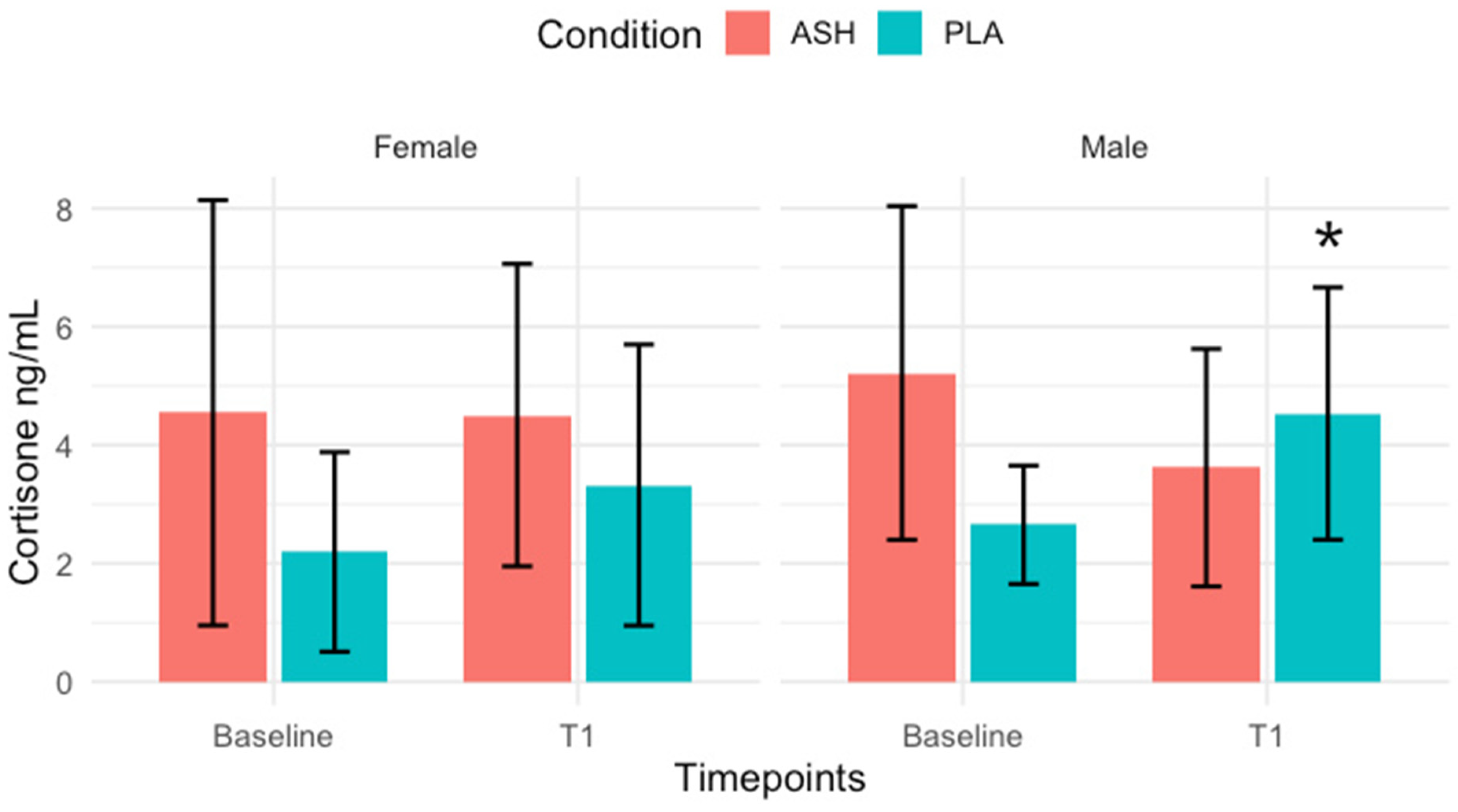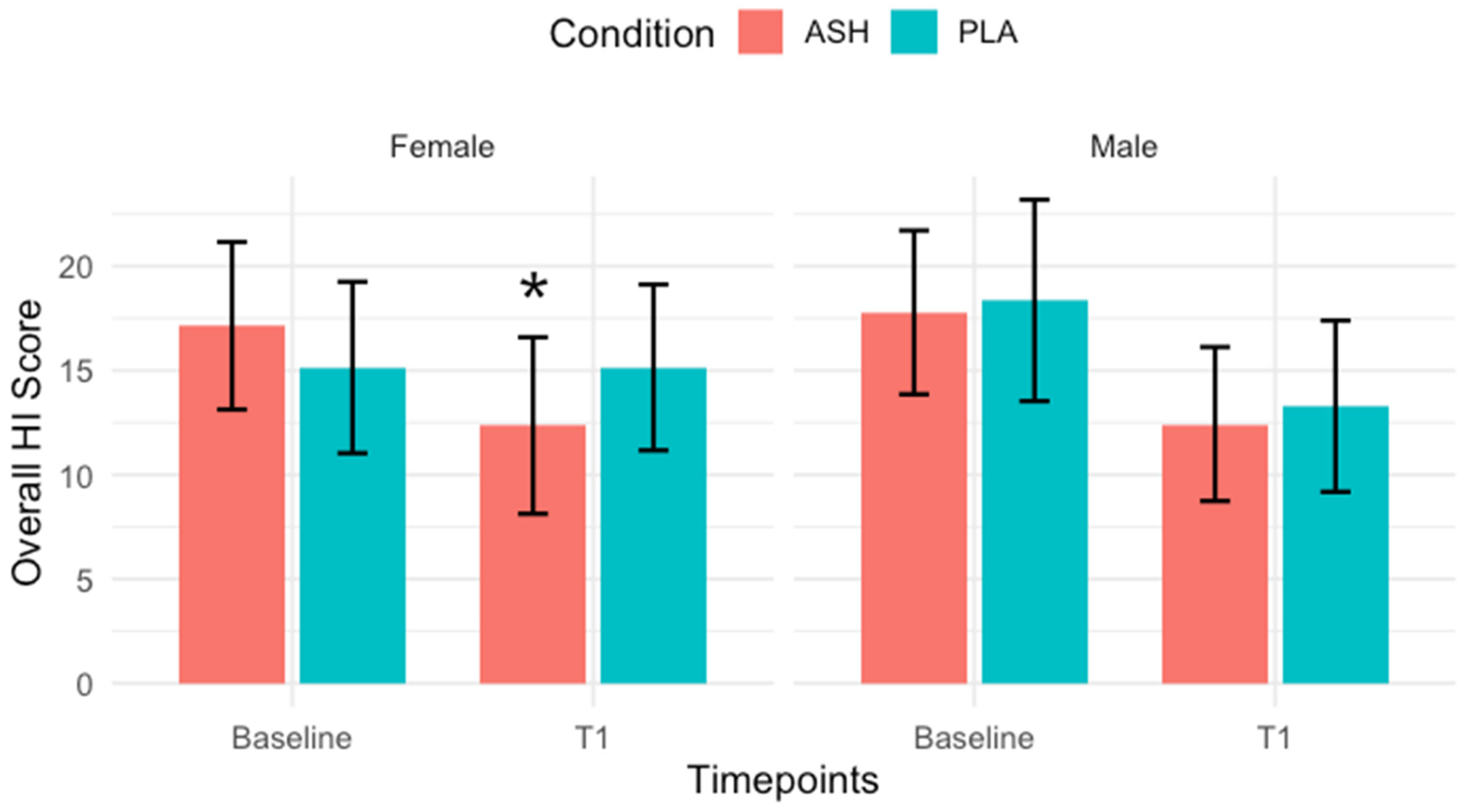 | Variable | Timepoint | Male ASH (n = 14) | Male PLA (n = 14) | 95% CI | Baseline p-Value | Group × Time p-Value |