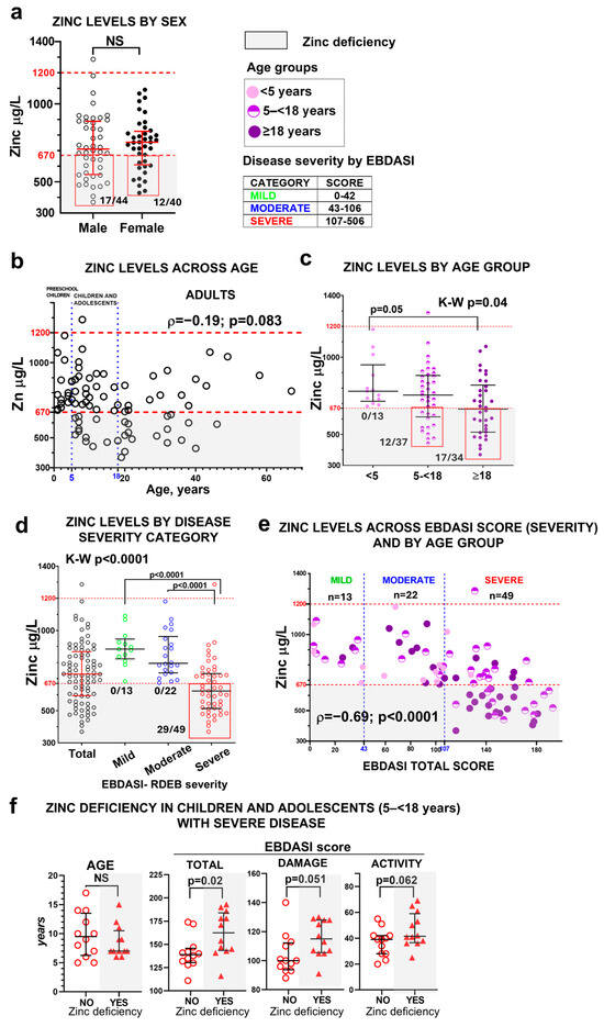 Zinc status in the RDEB cohort. Serum zinc levels are shown according to sex (a); across age as a continuous variable (b); by age group (preschool children <5 years, children and adolescents 5–<18 years, and adults ≥18 years) (c); by EBDASI severity categories (mild <43 points, moderate 43–106 points, and severe ≥107 points) (d). Panel (e) shows the relationship between serum zinc levels and the EBDASI score as a continuous variable, also stratified by age group. Statistical analyses include an unpaired t-test for panel (a), the Kruskal–Wallis test followed by Dunn’s multiple comparison test for panels (c,d), and Spearman’s rank-order correlation coefficient (ρ) for panels (b,e). NS indicates non-significant results (p > 0.05). Error bars represent the median and interquartile range, and dashed lines denote the normal zinc reference range (red) and EBDASI severity thresholds (blue). Panel (f) shows the comparison of age (Mann–Whitney test) and EBDASI severity scores (unpaired t-test) in children and adolescents with severe disease, stratified by zinc status (with or without zinc deficiency, n = 12 per group) with error bars representing the median and interquartile range. Gray shading indicates zinc deficiency.