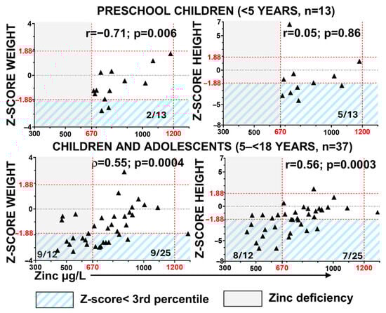 We assessed the correlation between zinc levels and Z-scores by age for weight (ponderal growth) and height (linear growth) (Figure 2). In preschool children, 15% (2/13) and 38% (5/13) had weight and height values below the 3rd percentile, respectively. However, only weight Z-scores exhibited a significant correlation with zinc levels in this group. In children and adolescents, the percentages of growth impairment increased in parallel with the rising prevalence of zinc deficiency (Figure 2), and a moderate positive correlation was observed between zinc levels and both height and weight Z-scores. Impaired ponderal growth occurred in 75% of zinc-deficient patients versus 36% of patients with normal blood zinc levels (χ2, p = 0.04), and stunted linear growth was observed in 67% versus 28%, respectively (χ2, p = 0.04). These findings suggest that zinc deficiency is associated with impaired growth in paediatric patients with RDEB.