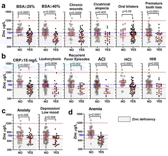 Lower serum zinc levels in patients presenting with the most frequent complications in RDEB. Zinc levels, analyzed as a continuous variable (µg/L), are compared between patients with (“Yes”, open squares) or without (“No”, solid circles) specific clinical outcomes: cutaneous and oral complications (a), inflammatory and infectious burden (b), psychological symptoms (c), and anemia (d). Statistical analysis (p-value) was performed using an unpaired t test. Dashed lines indicate the normal zinc range (red) and the proposed threshold for preventive supplementation (780 µg/L; blue). %BSA = percentage of body surface area affected; CRP = C-reactive protein; ACI = active cutaneous infection; HCI = history of cutaneous infection; HHI = history of hospitalization due to serious infection (nonresponsive to oral antibiotics or sepsis). Gray shading indicates zinc deficiency.