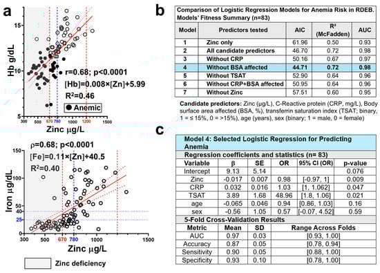Zinc levels as a predictor of anemia risk in RDEB. (a) Correlation of serum zinc levels (µg/L) with hemoglobin (Hb, g/dL; n = 84) and serum iron (µg/dL; n = 83) in patients with RDEB. Spearman’s rank-order correlation coefficient (ρ) and corresponding p-values are shown; linear regression lines (solid red lines) with 95% confidence intervals (dotted red lines) are displayed. Vertical dashed lines indicate the normal zinc range (in red) and the proposed threshold for preventive supplementation (780 µg/L; blue) Gray shading indicates zinc deficiency. (b) Comparison of logistic regression models with different predictor sets and (c) summary of the final selected model (Model 4), including 5-fold cross-validation results. Blue shading highlights the selected model. CRP = C-reactive protein; BSA = Body surface area; TSAT = transferrin saturation; AIC = Akaike Information Criterion; R2 (McFadden) = pseudo-R2; AUC = area under the receiver operating characteristic curve. β = represent log-odds from the logistic regression model predicting anemia risk (1 = anemic, 0 = non-anemic); SE = Standard error of the β coefficient; OR = odds ratio (eβ); p-value = statistical significance of each predictor; 95% CI (OR): confidence interval for OR estimates, reported as [lower, upper] SD = Standard deviation.