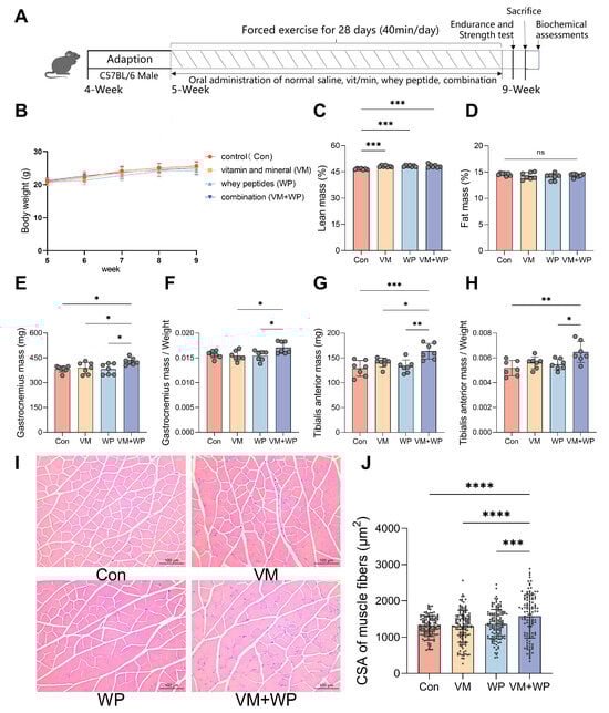 Mice were divided into four groups and subjected to forced exercise using a treadmill for four weeks. Simultaneously, four groups received one of four daily dietary interventions, either with saline (Con), a micronutrient complex (vitamins and minerals, VM), whey peptides (WP), or a combination of micronutrient complex and whey peptides (VM + WP) during the four-week exercise period (Figure 1A).