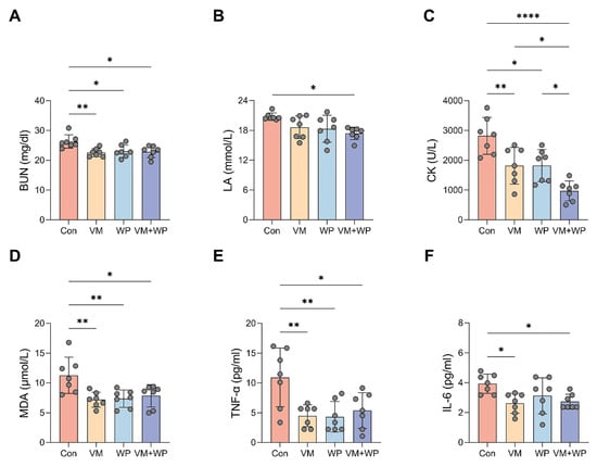 Effects of whey peptides and micronutrients on serum markers reflecting exercise performance (n = 7 in each group). In mice receiving saline (Con), micronutrient complex (vitamins and minerals, VM), whey peptides (WP), or micronutrient complex and whey peptides (VM + WP), the following serum parameters were measured: (A) Blood urea nitrogen (BUN), (B) lactate acid (LA), (C) creatine kinase (CK), (D) malondialdehyde (MDA), (E) tumor necrosis factor-α (TNF-α), and (F) interleukin-6 (IL-6). Statistical significance was determined by one-way ANOVA with Duncan’s range test for multiple comparisons (* p < 0.05, ** p < 0.01, **** p < 0.0001).
