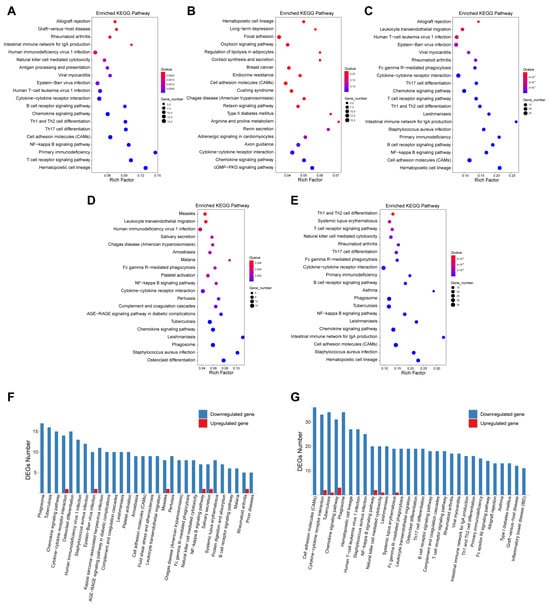 Compared with the control group, Kyoto Encyclopedia of Genes and Genomes (KEGGs) pathway analysis revealed that DEGs in both the VM group and the VM + WP group were enriched in hematopoietic cell lineage, the NF−kappa B signaling pathway, and the B cell receptor signaling pathway, whereas the chemokine signaling pathway was enriched in both the VM group and the WP group (Figure 4A–C). Additionally, DEGs were enriched in the phagosome, chemokine signaling pathway, cytokine–cytokine receptor interaction, NF–kappa B signaling pathway, and Fc gamma R-mediated phagocytosis pathways when comparing the VM + WP group with the VM group or the WP group (Figure 4D,E). Notably, most genes in these immunoregulatory pathways exhibited a downregulation trend (Figure 4F,G) [31]. This systematic downregulation of immunoregulatory pathways suggests that the combination of whey peptides and micronutrients effectively attenuates the exercise-induced overactivation of inflammatory responses.