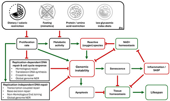 Dietary interventions influence genome integrity and aging-associated processes. Schematic overview of how dietary interventions modulate cellular metabolism and genomic maintenance. As caloric/dietary restriction yields the most robust effects, other diets are depicted in lighter tones. Interventions reduce proliferation and metabolic activity, lowering reactive oxygen species while improving replication-independent DNA repair, which together limit genomic instability. Enhanced DNA repair and reduced oxidative stress reduces apoptosis, senescence, and inflammation, contributing to improved tissue homeostasis and lifespan extension. Green arrows indicate promoting effects; red blunt lines indicate inhibition. Green and red outlines indicate positive and negative processes, respectively.
