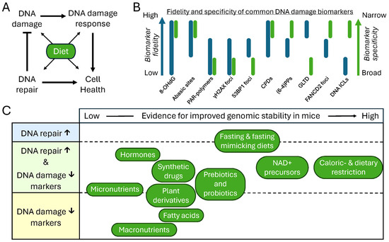 Schematic representation of consumable interventions and their impact on DNA damage and repair. (A) Simplified schematic depicting the relationships between DNA damage burden, DNA repair, DNA damage response signaling, and cellular health, which all could be affected by dietary interventions. Note that by altering metabolism, diet could influence DNA damage bidirectionally. (B) Relative technique-dependent detection fidelity (blue) and biomarker specificity (green) of commonly used DNA damage markers. Bar ranges reflect variability among measurement techniques and biomarker specificity (also see details on biomarker specificity and accuracy/reliability of the detection method in Table 1). (C) Interventions are categorized into three groups: those that increase DNA repair (top), those that reduce DNA damage (bottom), and those that have dual effects (middle). The horizontal positioning of interventions reflects the strength of evidence supporting their effects, with those on the right, such as CR/DR, being more strongly supported by evidence than those on the left, which in contrast mostly consisted of interventions based on a few studies, sometimes using only a single marker.