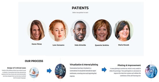 The E+DIEting Lab self-learning platform is a robust, web-based application accessible at https://virtual-patient.edietinglab.eu/ (accessed on 12 December 2025). It offers a secure, user-friendly environment where registered users can interact with virtual patient chatbots designed to simulate diverse clinical nutrition scenarios. User registration and authentication mechanisms were implemented to ensure controlled access, supporting role differentiation among students, educators, and other stakeholders.