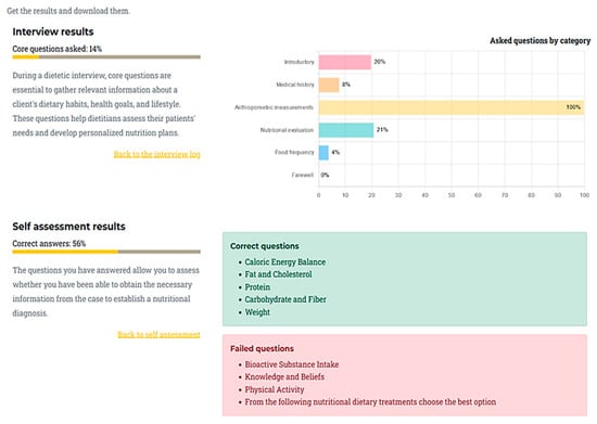 - Self-Assessment: After the interview, users complete a set of multiple-choice questions related to the case, based on the IDNT, covering Intake, Clinical, Behavioral and Environmental, and Dietary treatments.