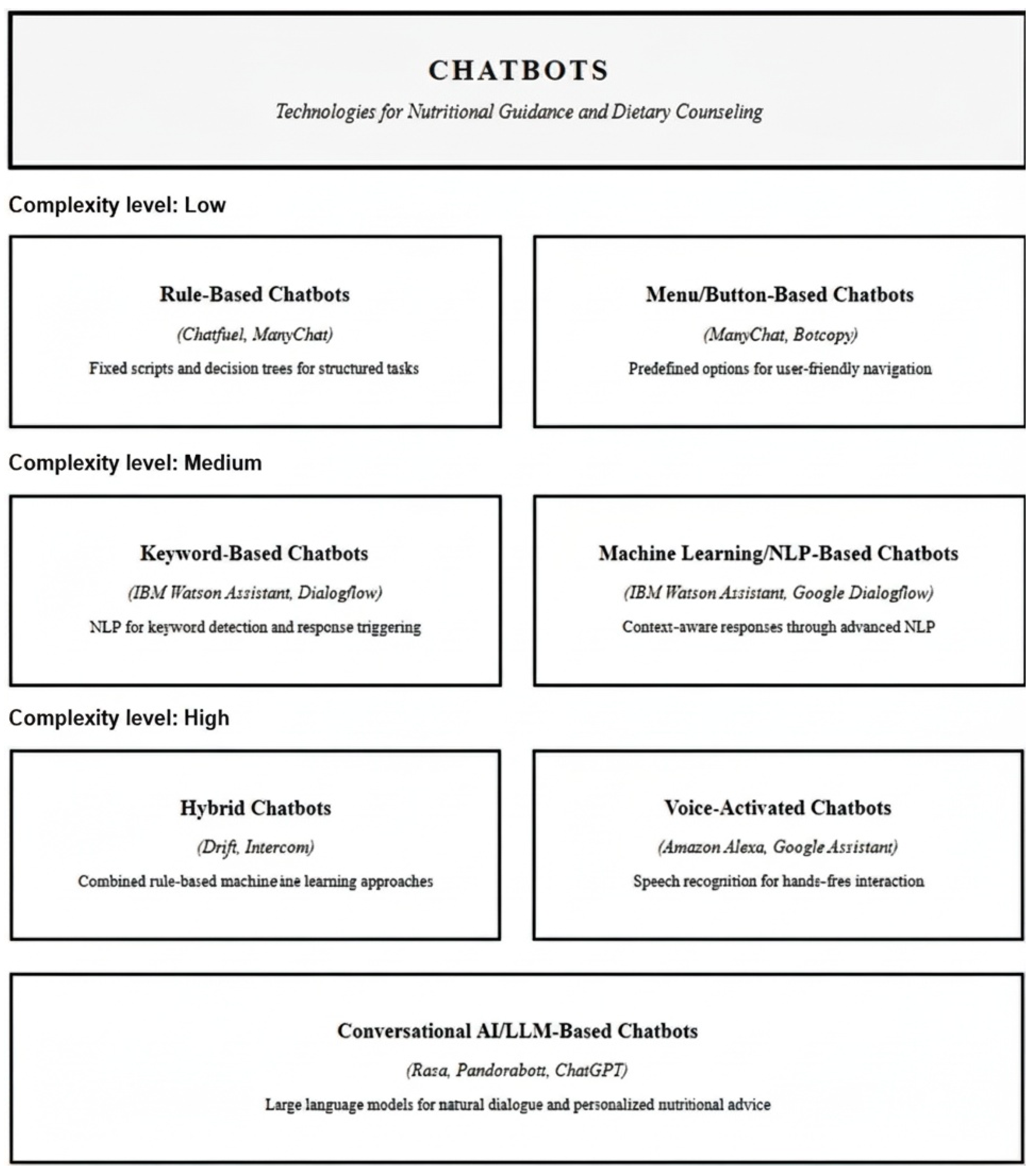 Chatbots used in healthcare and clinical nutrition can be categorized according to their underlying technology and interaction style, each offering distinct advantages and limitations [