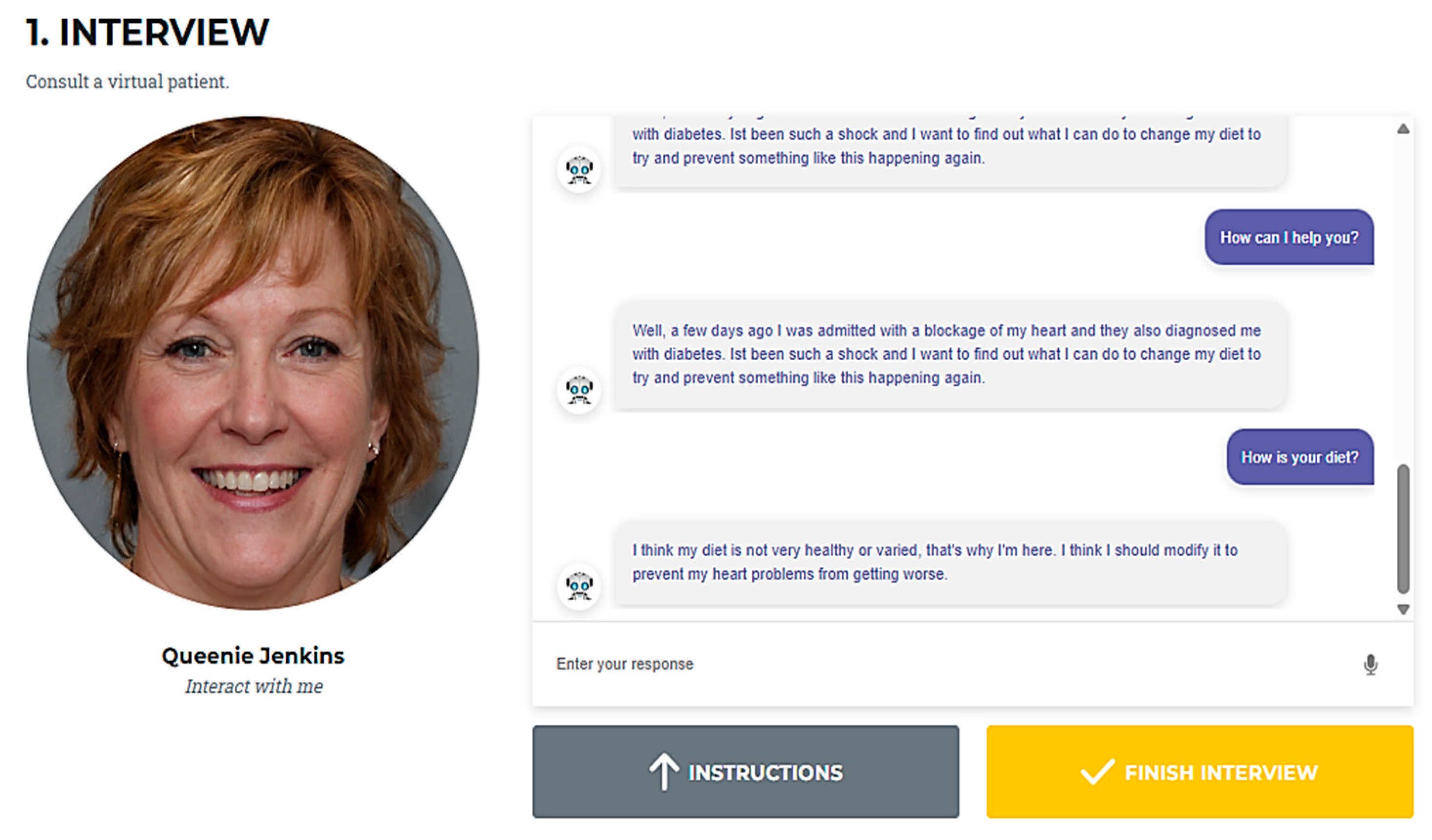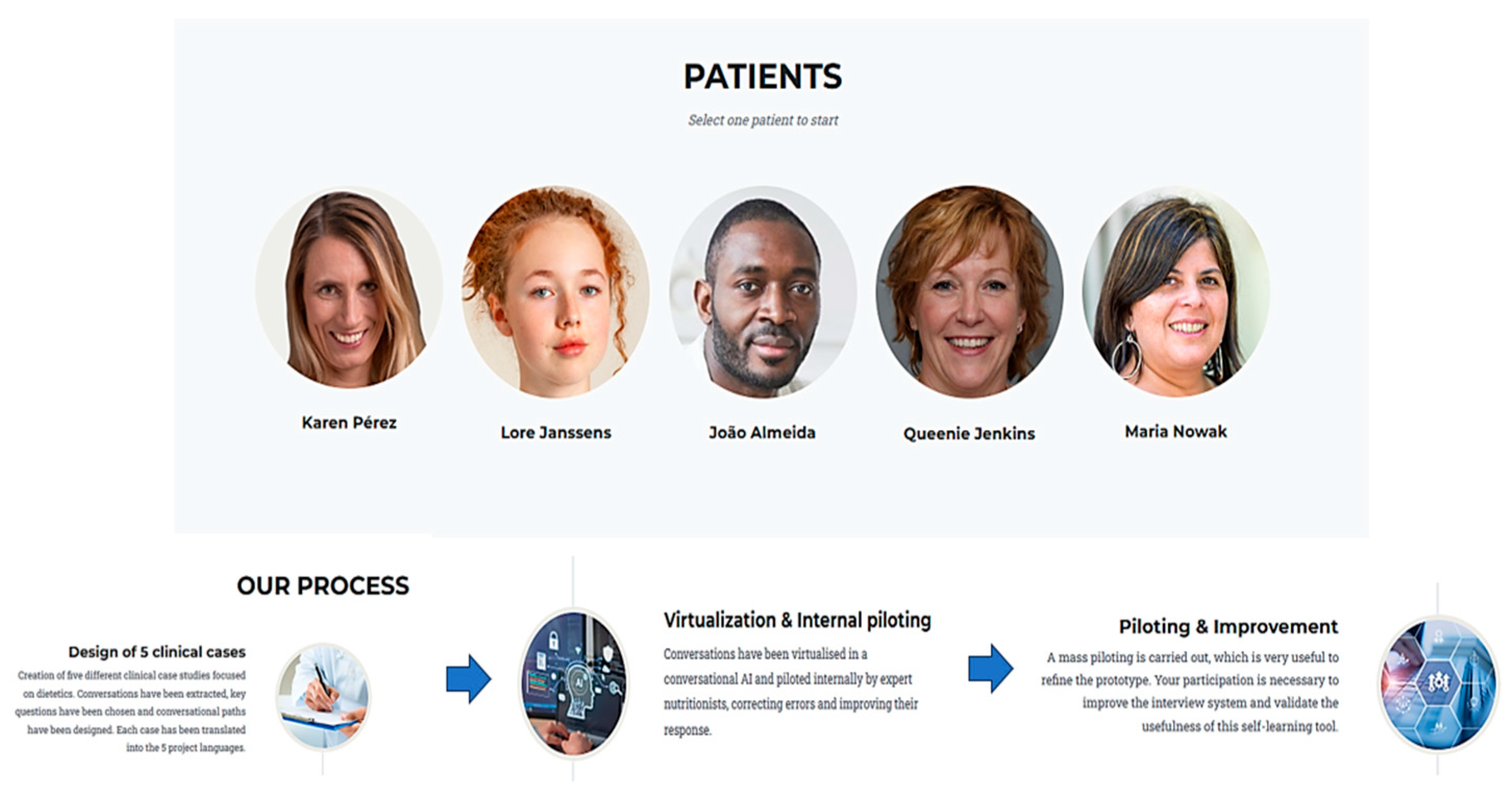 The user selects the virtual patient/chatbot with whom he/she wants to interact.