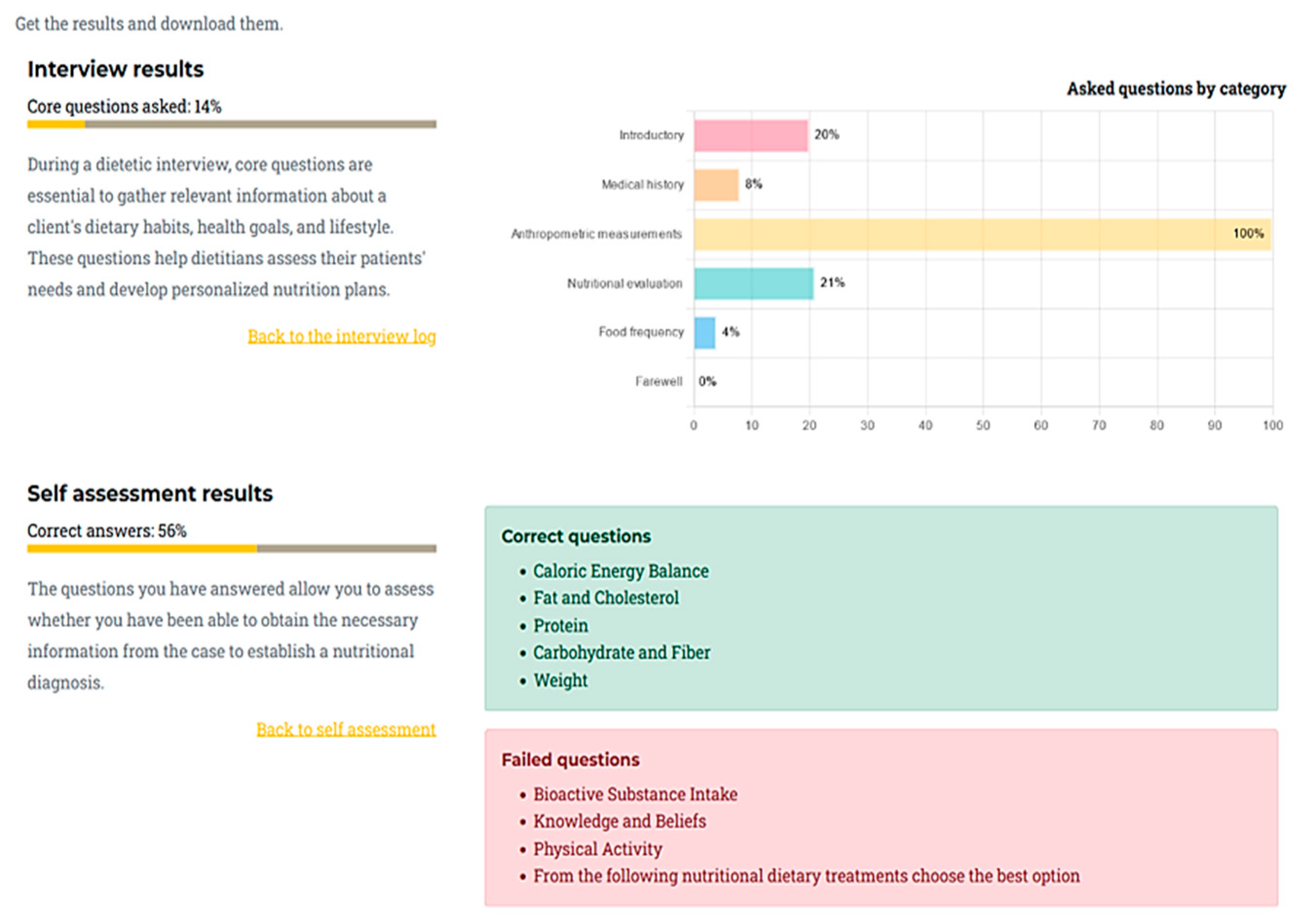 Self-Assessment: After the interview, users complete a set of multiple-choice questions related to the case, based on the IDNT, covering Intake, Clinical, Behavioral and Environmental, and Dietary treatments.