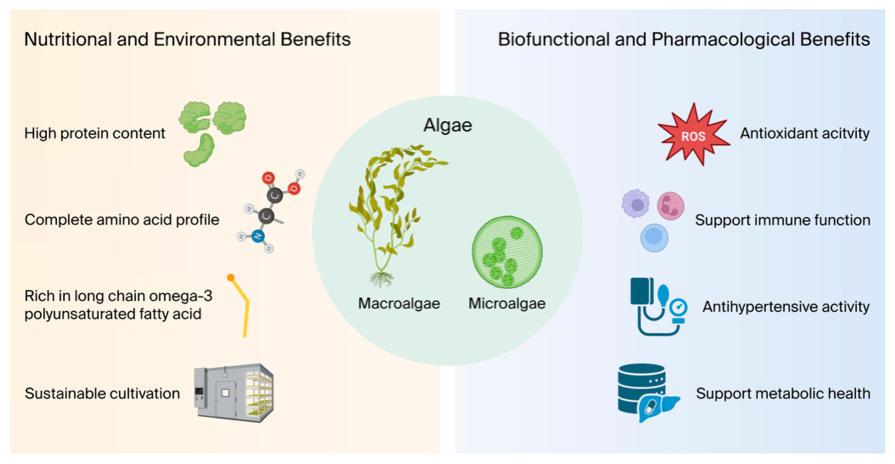 Figure 1. Overview of algae benefits, including nutritional, environmental, biofunctional and pharmacological effects (Created in BioRender. Zixuan W. (2025) https://doi.org/10.5281/zenodo.18243464. Icons used under Biorender’s Academic License).