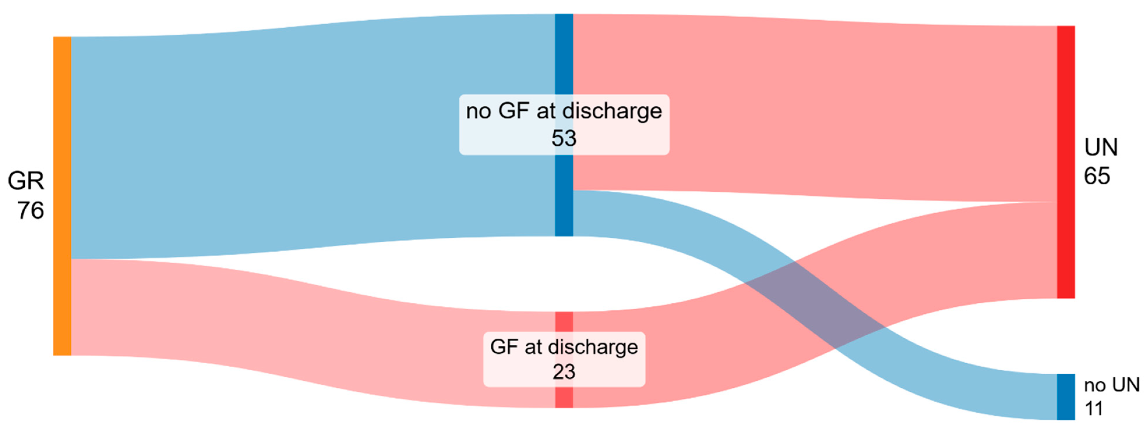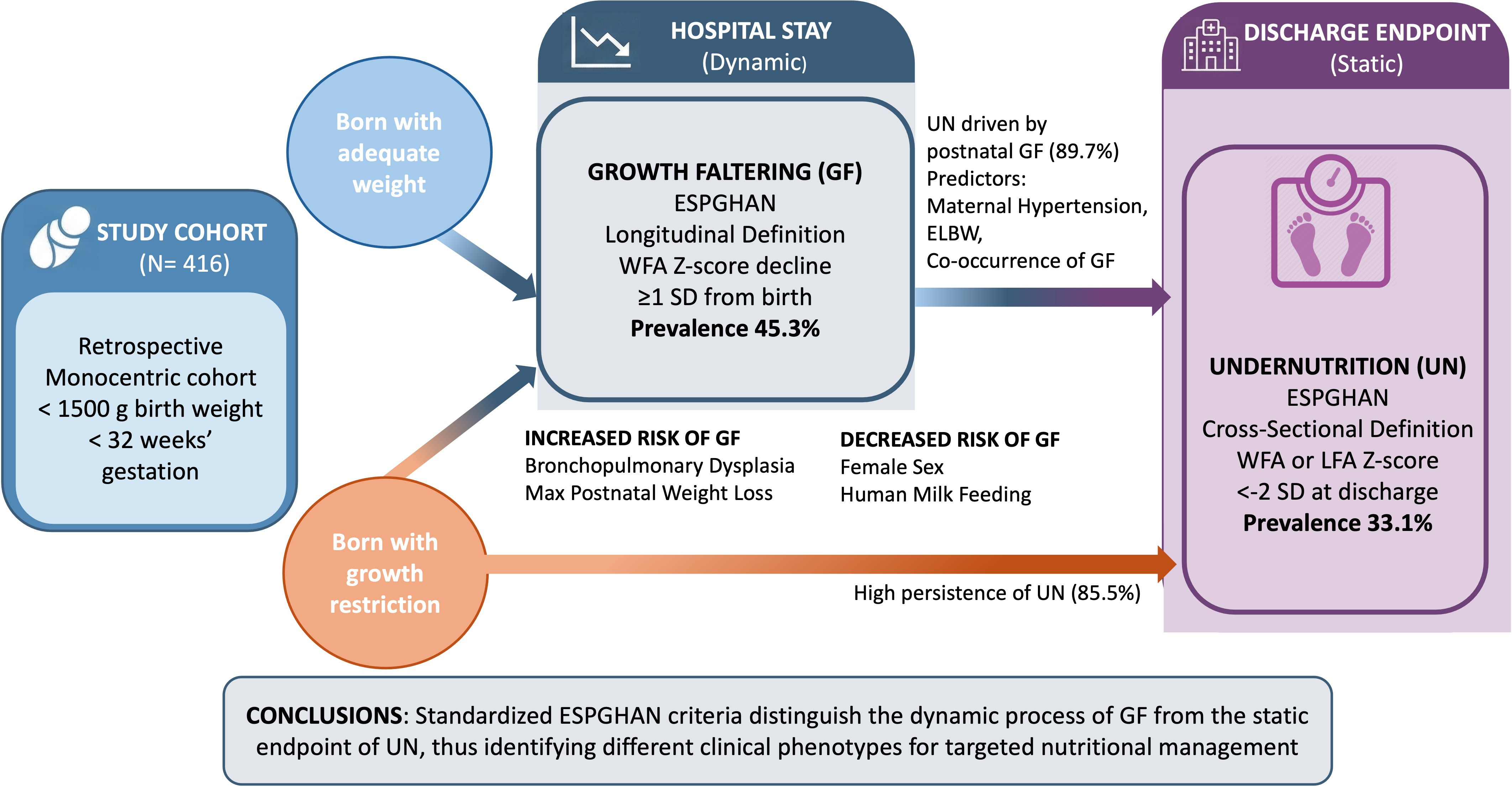 - At discharge, GF was defined as a fall in weight for age (WFA) z-score ≥ 1.0 from birth, while undernutrition (UN) as a weight for age (WFA) or length for age (LFA) z-score < −2 SDs.