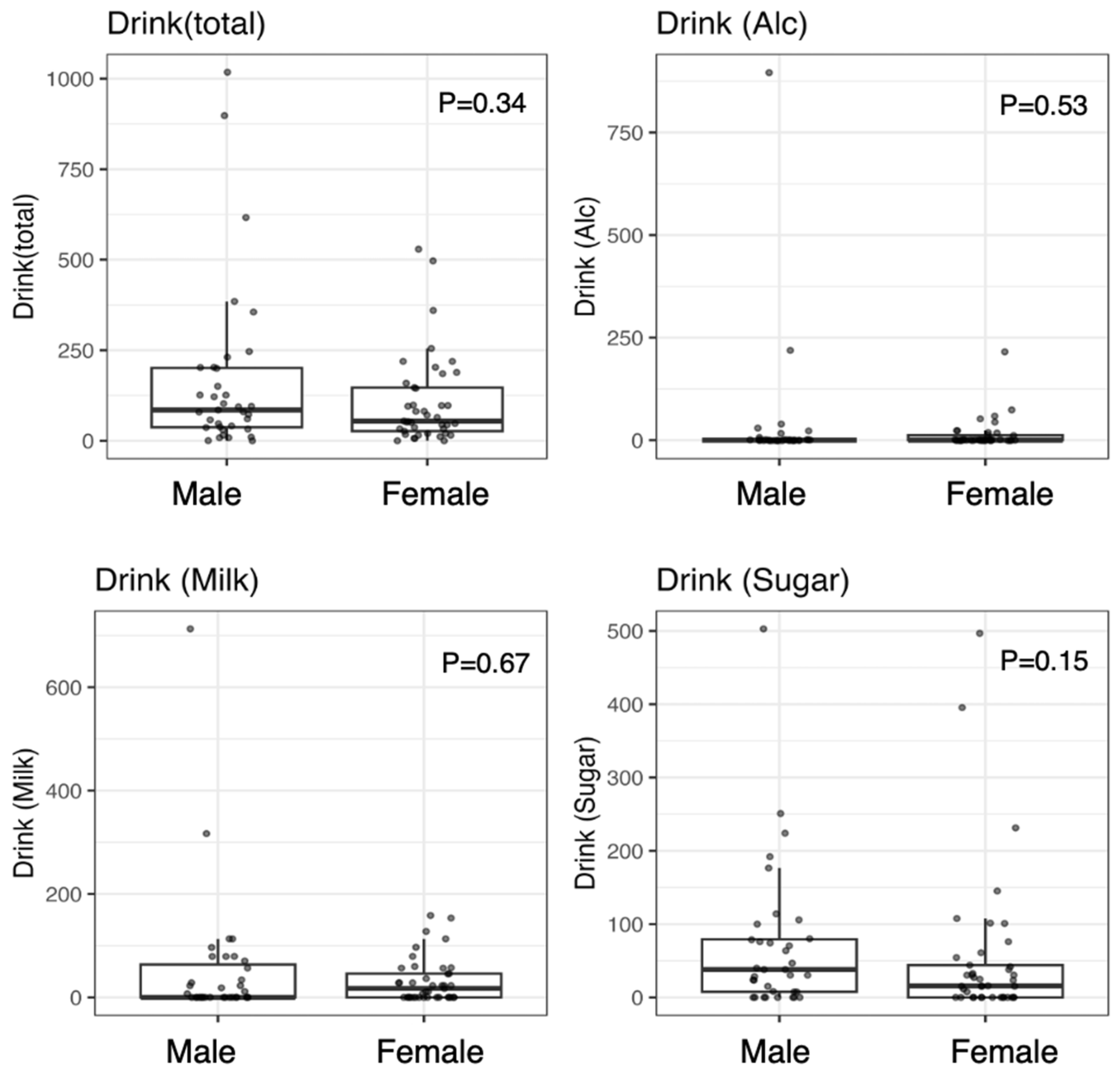 | Drink (Milk) | Drink (Sugar) | 76 | 0.19 (95%CI −0.04 to 0.42), p = 0.097 |