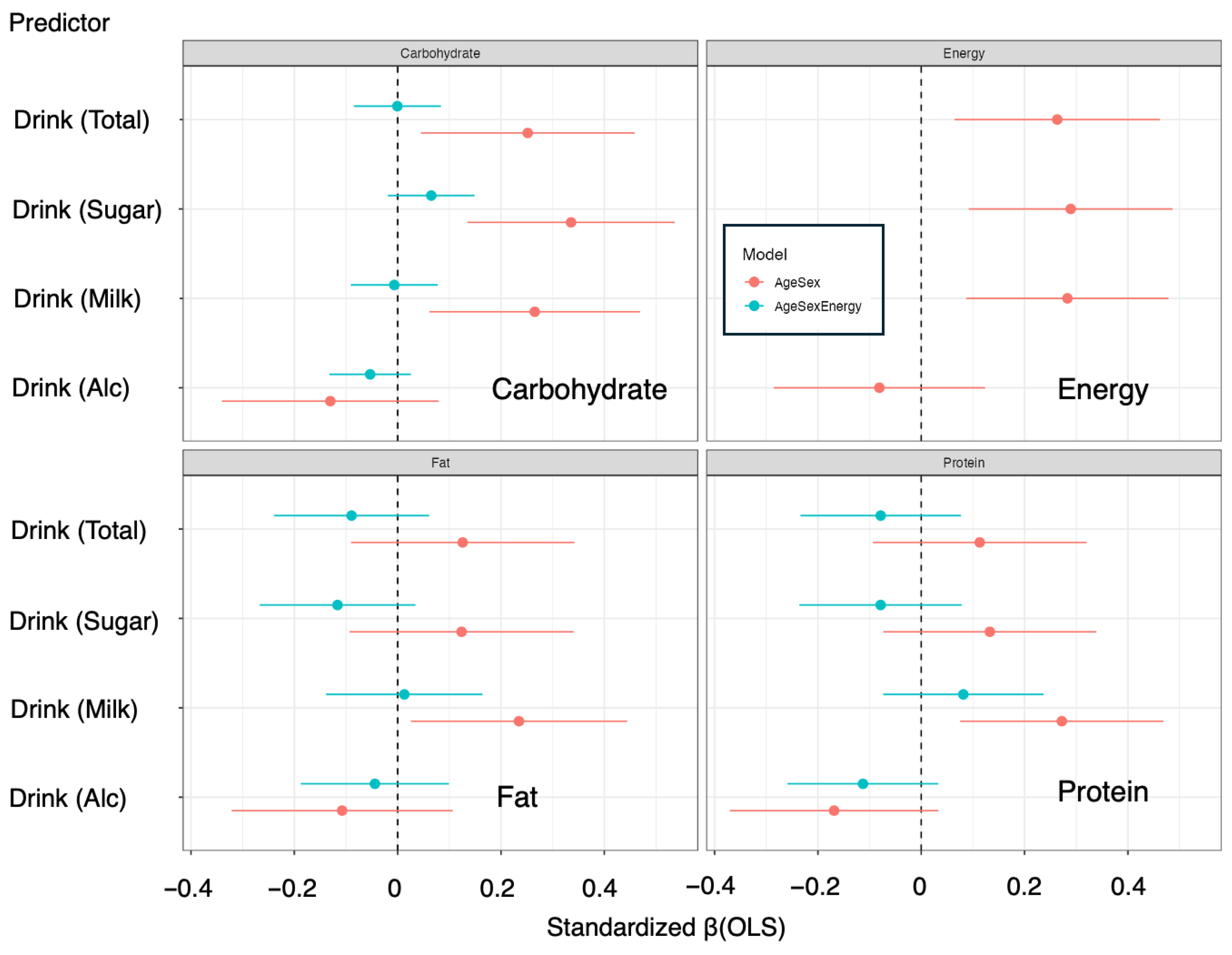 | Carbohydrate | Drink (Sugar) | 0.336 [0.135 to 0.536], p(OLS) = 0.00, p(QR) = 0.01, p(GAM) = 0.00 | 0.065 [−0.019 to 0.149], p(OLS) = 0.13, p(QR) = 0.12, p(GAM) = 0.13 |