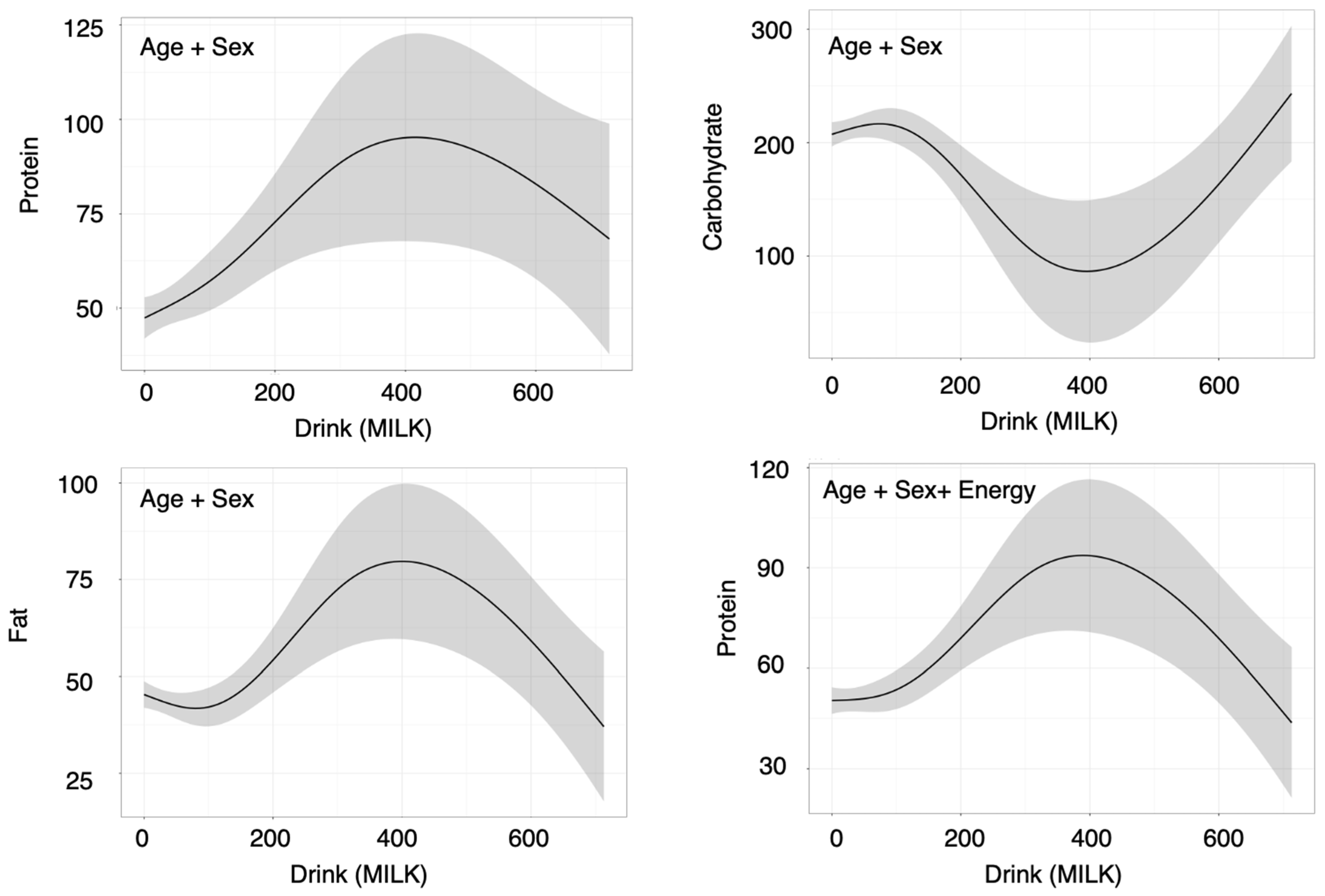 | Protein | Drink (Milk) | 0.272 [0.075 to 0.469], p(OLS) = 0.01, p(QR) = 0.69, p(GAM) = 0.01 | 0.081 [−0.074 to 0.237], p(OLS) = 0.31, p(QR) = 0.72, p(GAM) = 0.00 |