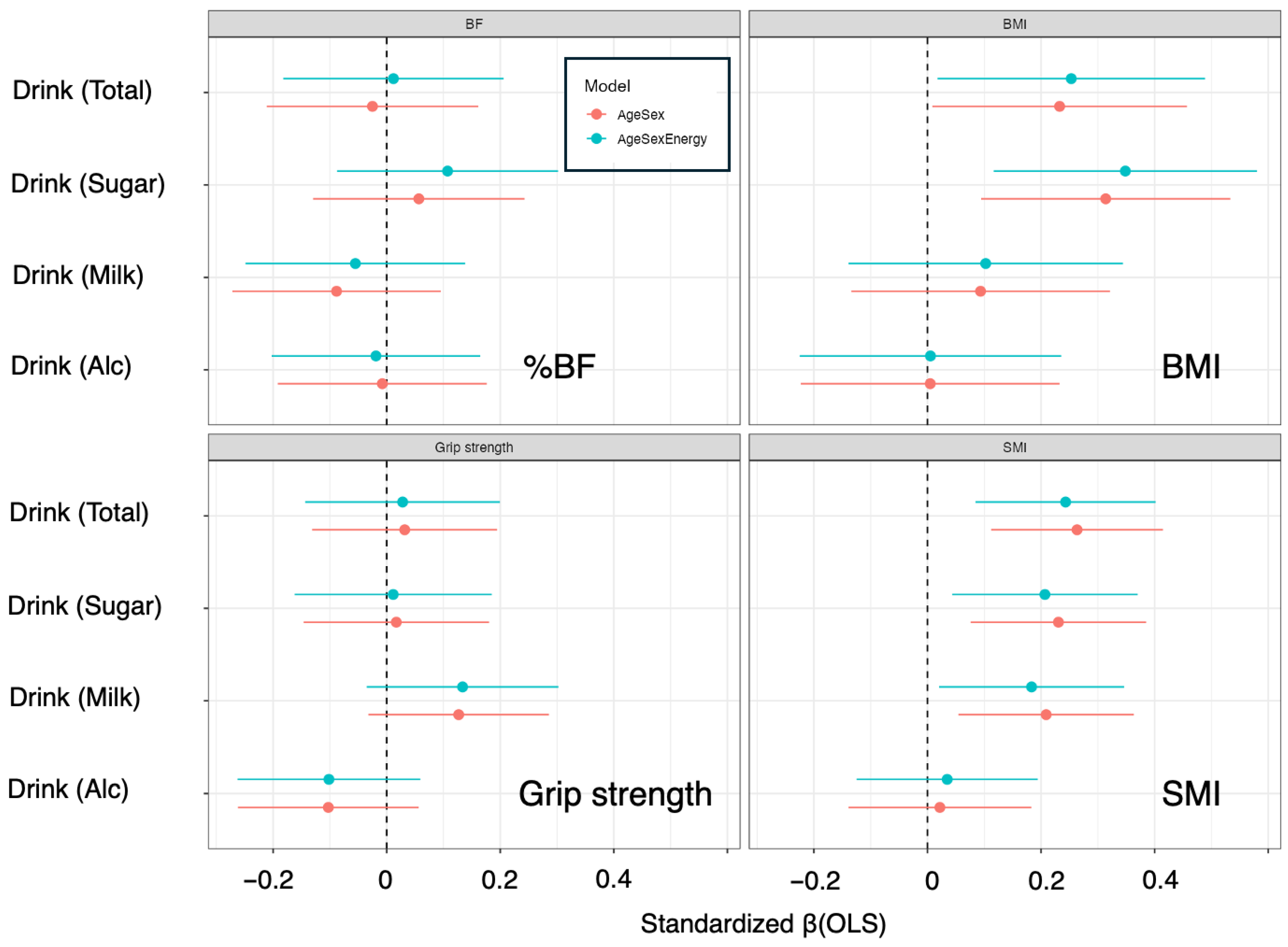 | BF | Drink (Sugar) | 0.057 [−0.130 to 0.243], p(OLS) = 0.55, p(QR) = 0.72, p(GAM) = 0.42 | 0.107 [−0.087 to 0.302], p(OLS) = 0.28, p(QR) = 0.80, p(GAM) = 0.30 |