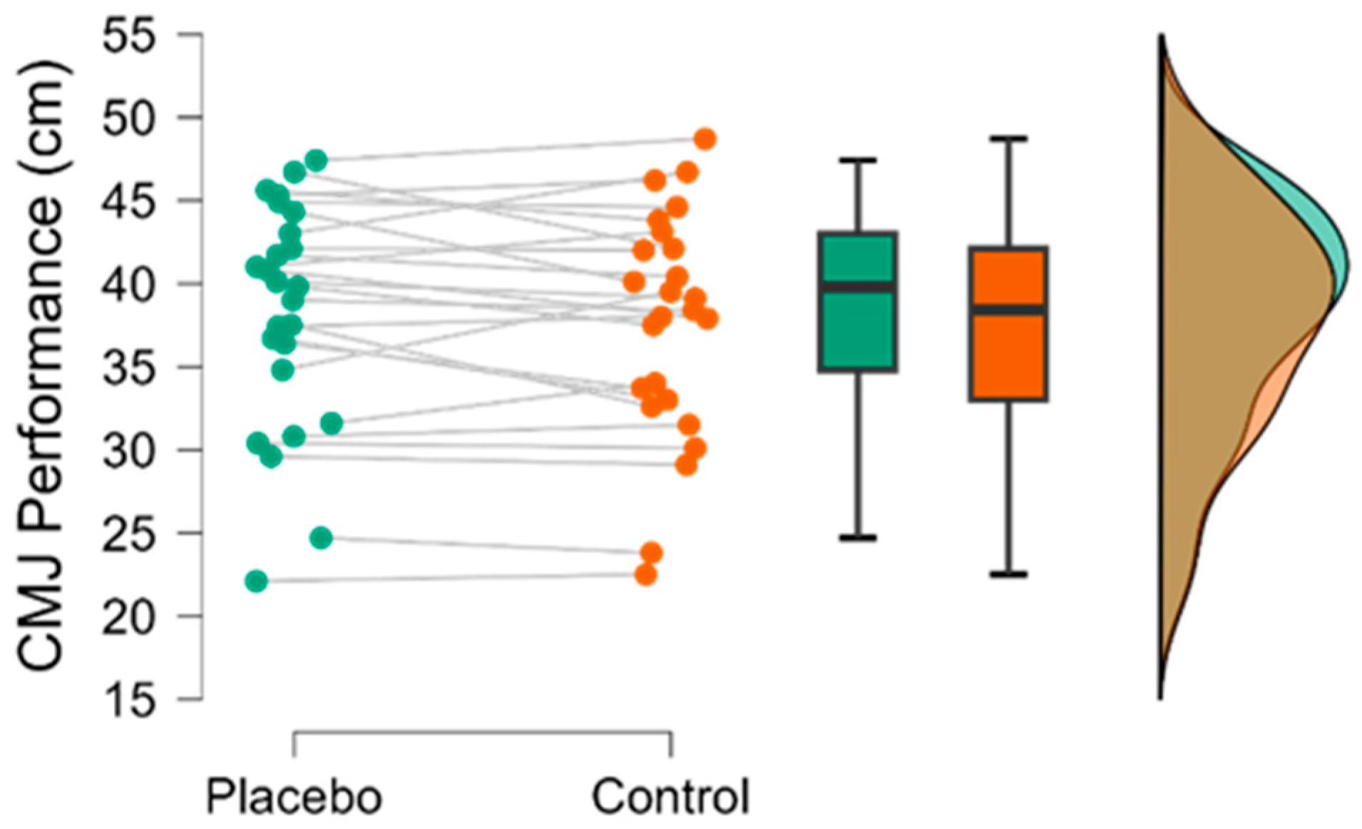 - Grgic, J.; Venier, S.; Mikulic, P. Both Caffeine and Placebo Improve Vertical Jump Performance Compared With a Nonsupplemented Control Condition. Int. J. Sports Physiol. Perform. 2021, 16, 448–451. [Google Scholar] [CrossRef]