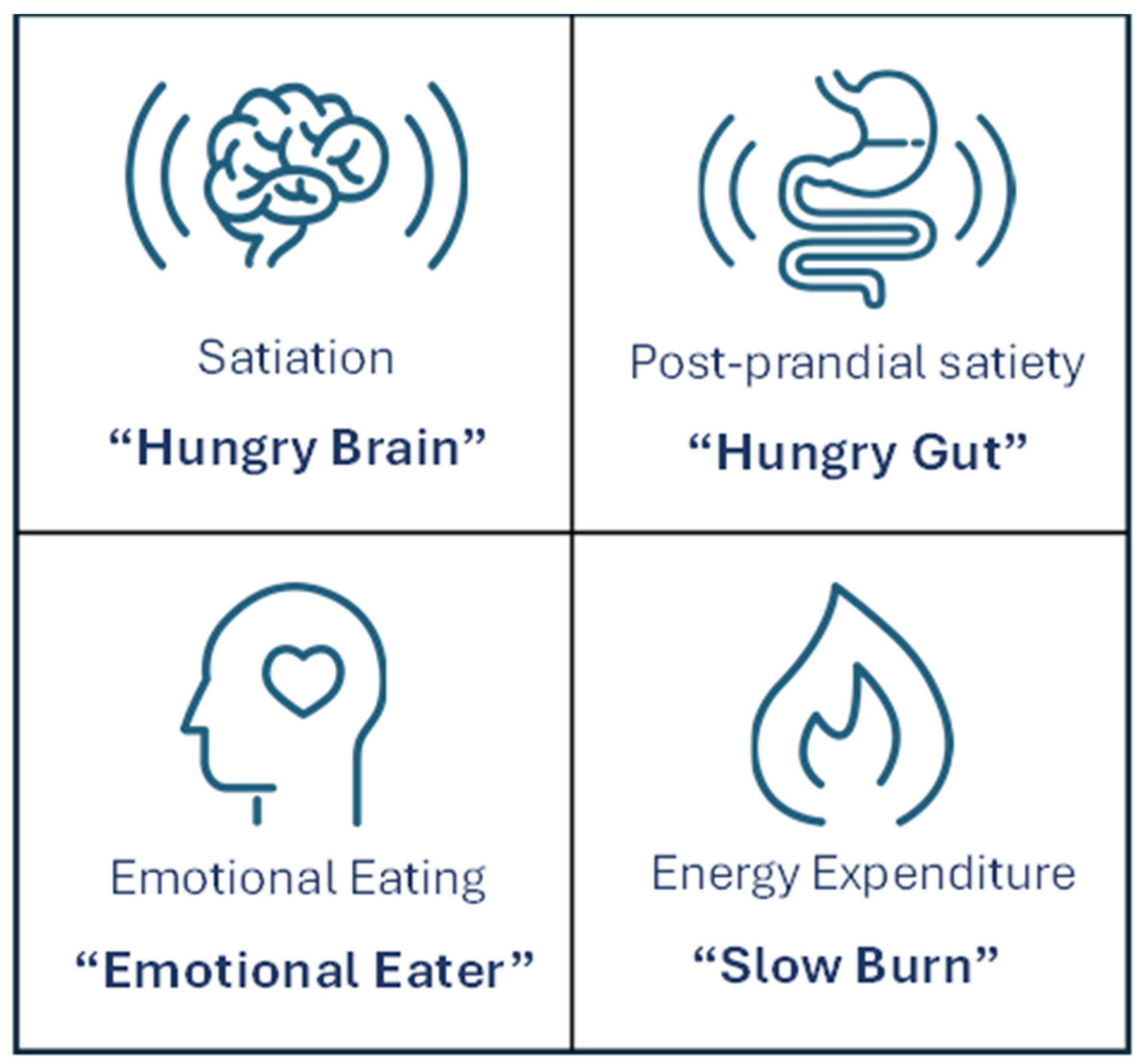 - Garutti, M.; Sirico, M.; Noto, C.; Foffano, L.; Hopkins, M.; Puglisi, F. Hallmarks of Appetite: A Comprehensive Review of Hunger, Appetite, Satiation, and Satiety. Curr. Obes. Rep. 2025, 14, 12. [Google Scholar] [CrossRef]