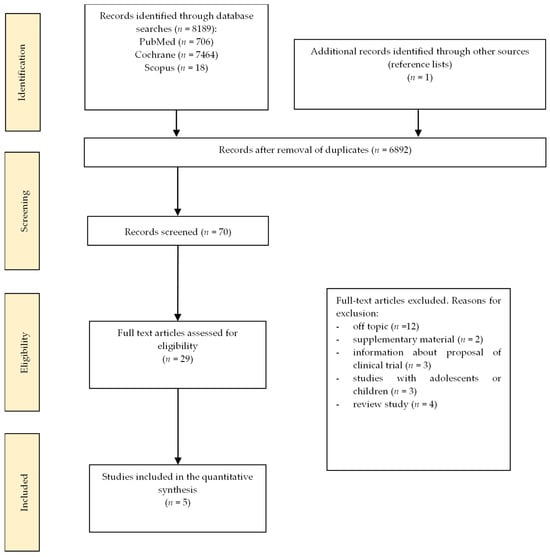 A flowchart of the study extraction process is presented in Figure 1. Initially, 8189 articles were identified, of which 29 were selected for full-text review. Finally, five publications met the inclusion criteria and were included in the final analysis.