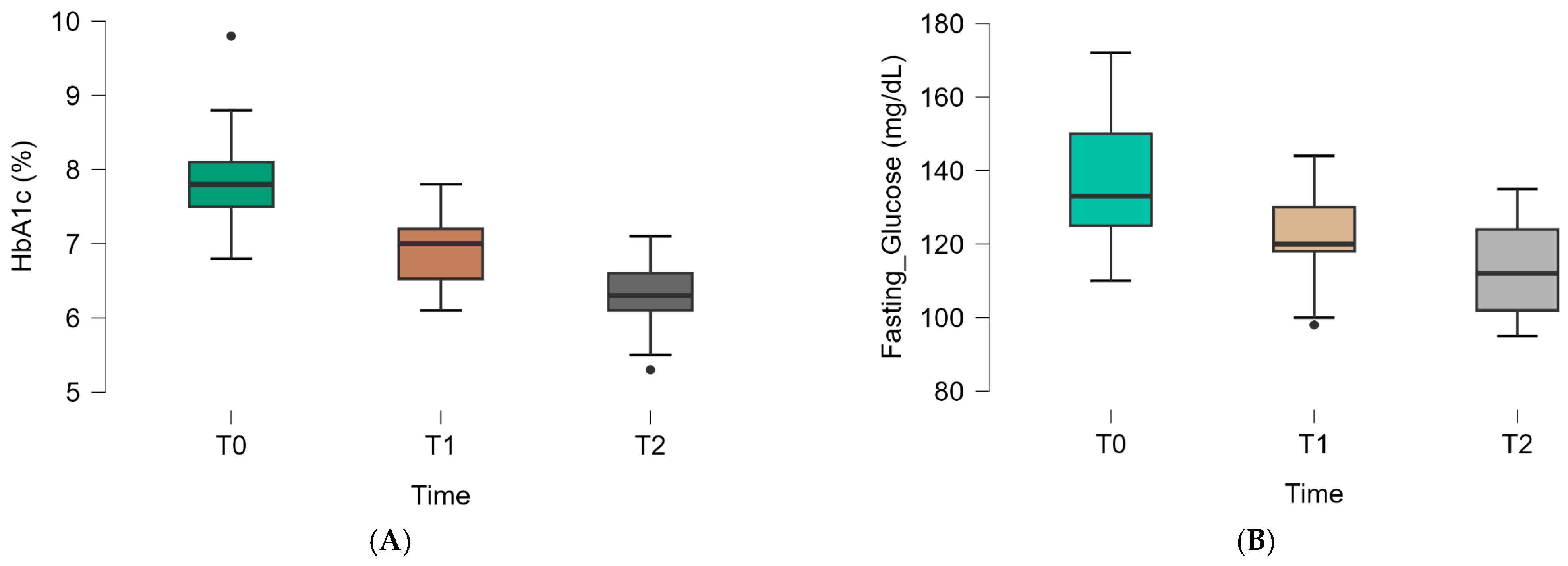 - T1–T2: Δ = −9.0 mg/dL (95% CI: −12.7 to −5.3), p < 0.001, Cohen’s dz = 0.83;