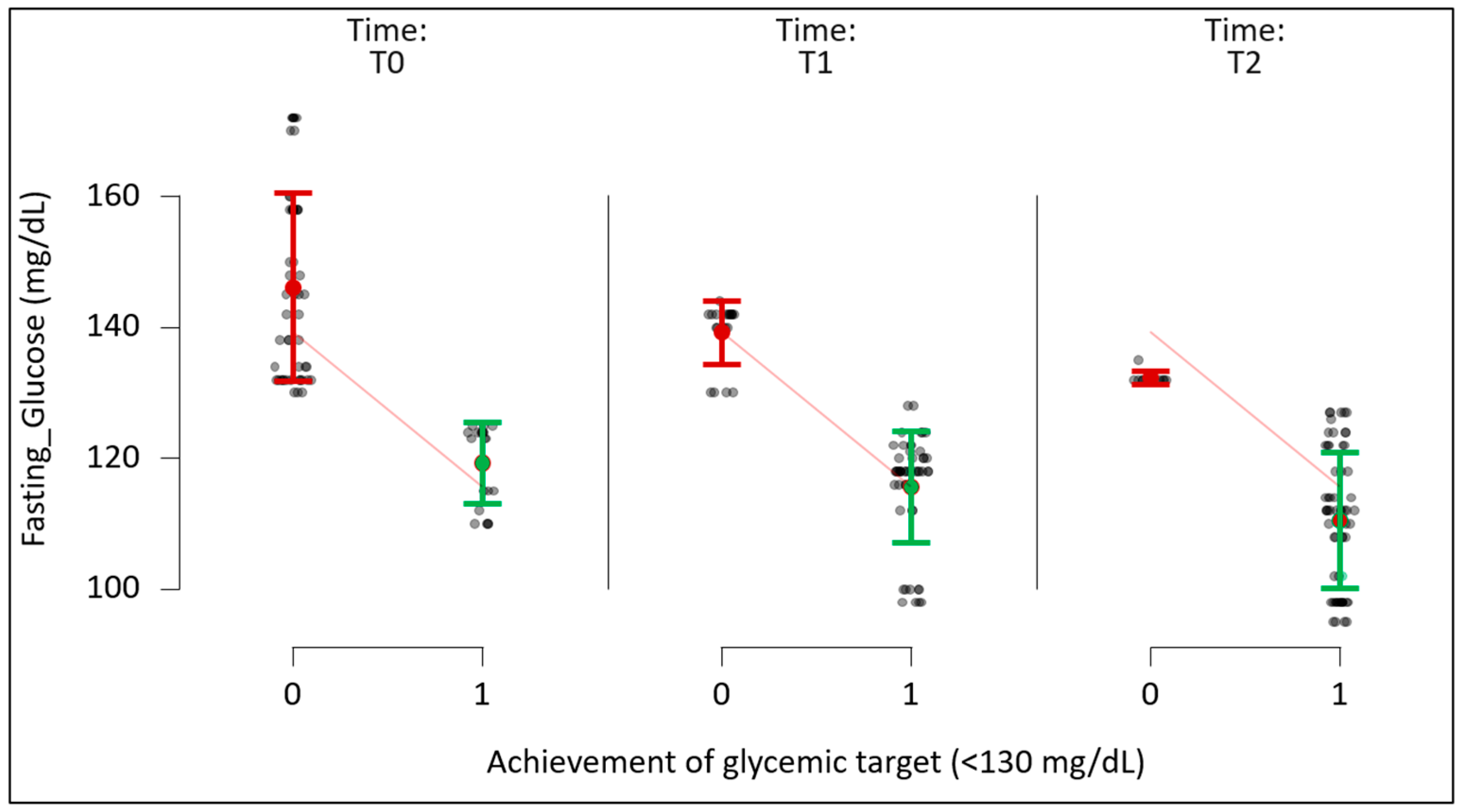 - T0–T2: Δ = −25.1 mg/dL (95% CI: −29.8 to −20.4), p < 0.001, Cohen’s dz = 1.56.