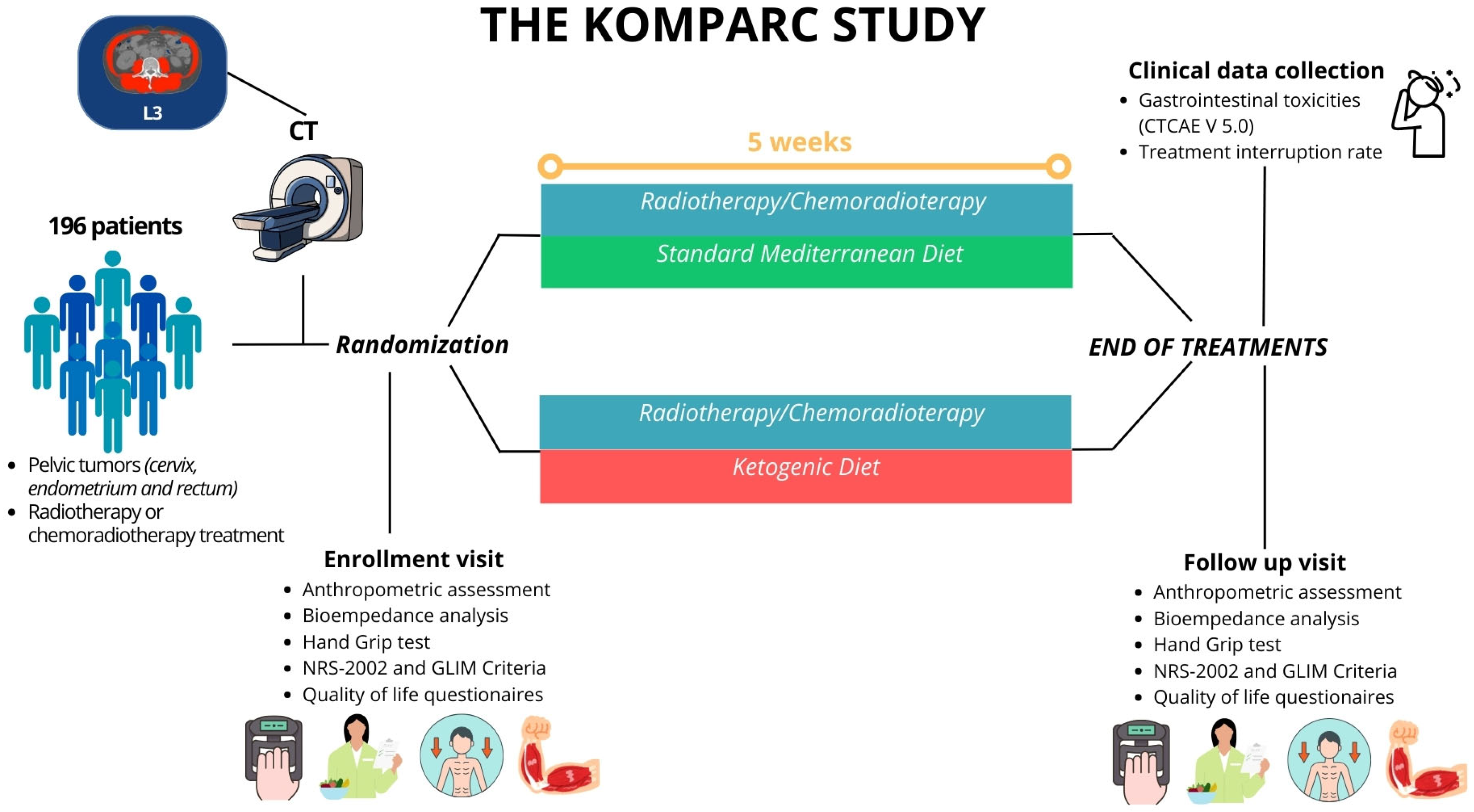 Cintoni, M.; Autorino, R.; Rinaldi, R.M.; Leonardi, E.; Palombaro, M.; Chiloiro, G.; De Luca, V.; Raoul, P.C.; Rinninella, E.; Capristo, E.; et al. Clinical Tolerability and Safety of Ketogenic Diet in Patients with Gynecological Malignancies Undergoing Radiotherapy: Preliminary Results of a Prospective, Randomized, Open-Label Trial (KOMPARC). Nutrients 2026, 18, 312. https://doi.org/10.3390/nu18020312