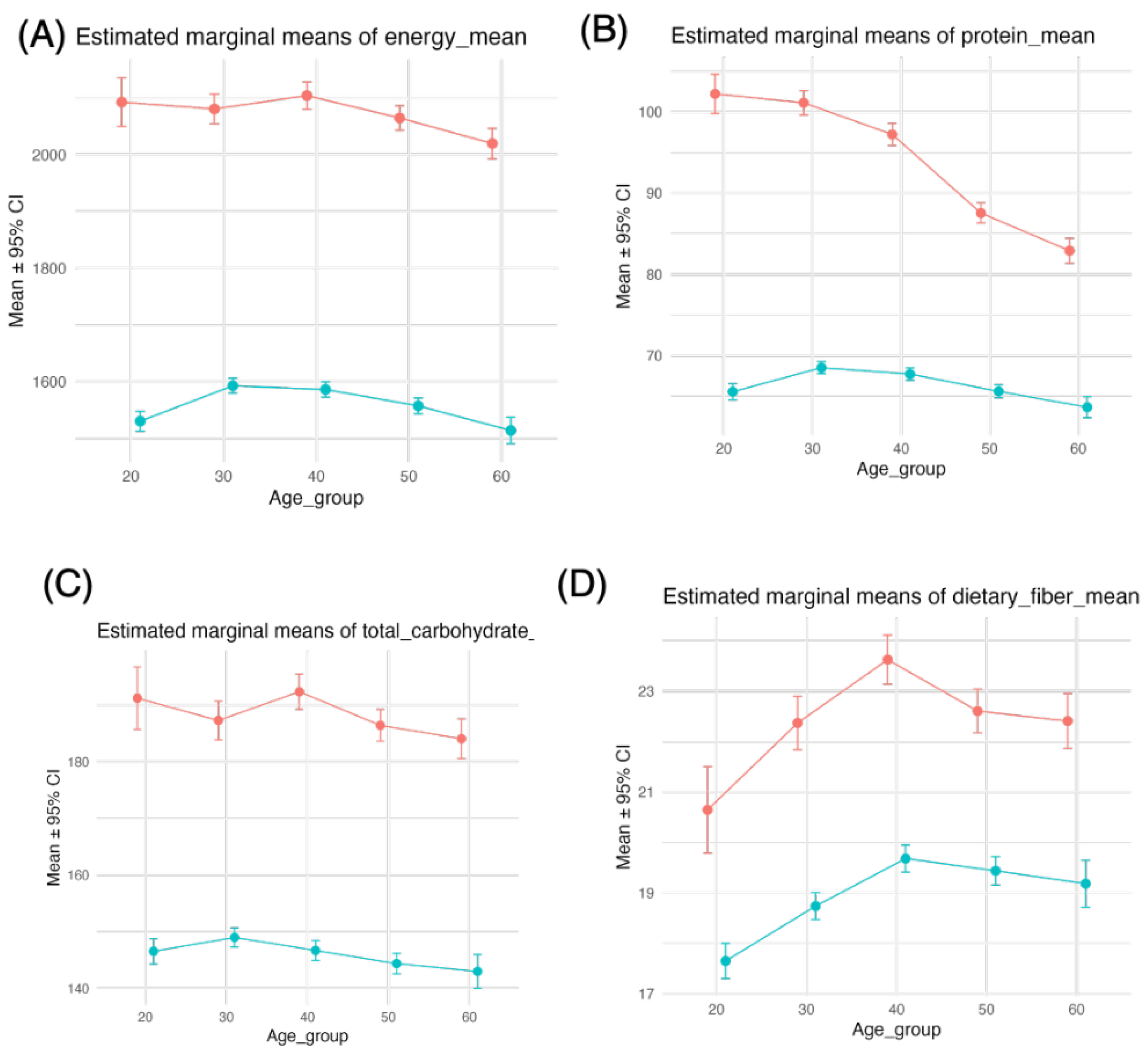 3.2.1. Associations Between Energy, Protein, and Carbohydrate and Age, Sex, and Their Interaction