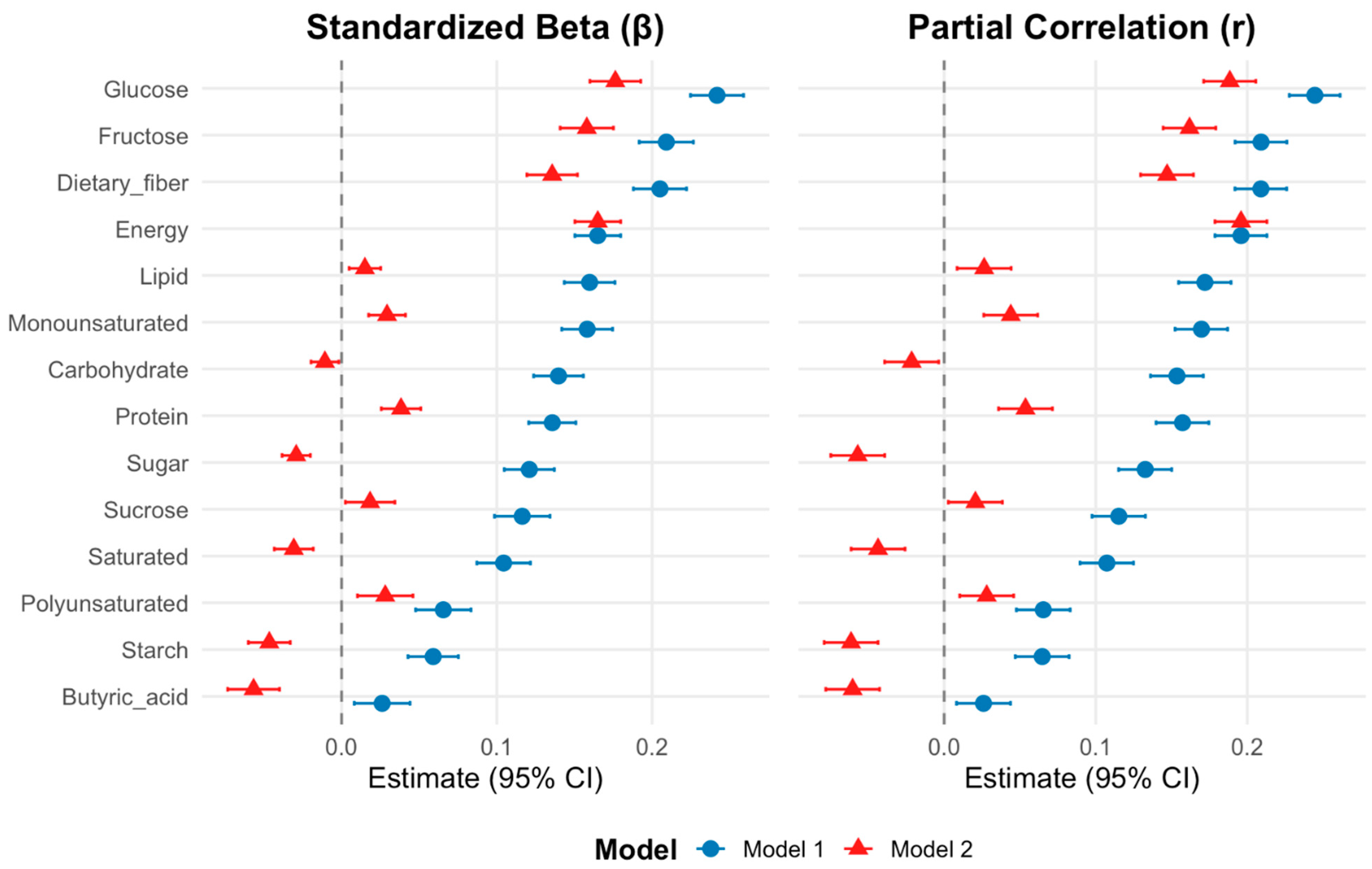 2.3.3. Linear Regression Models Adjusted for Sex and Age (Model 1) and Sex, Age, and Energy Intake (Model 2)