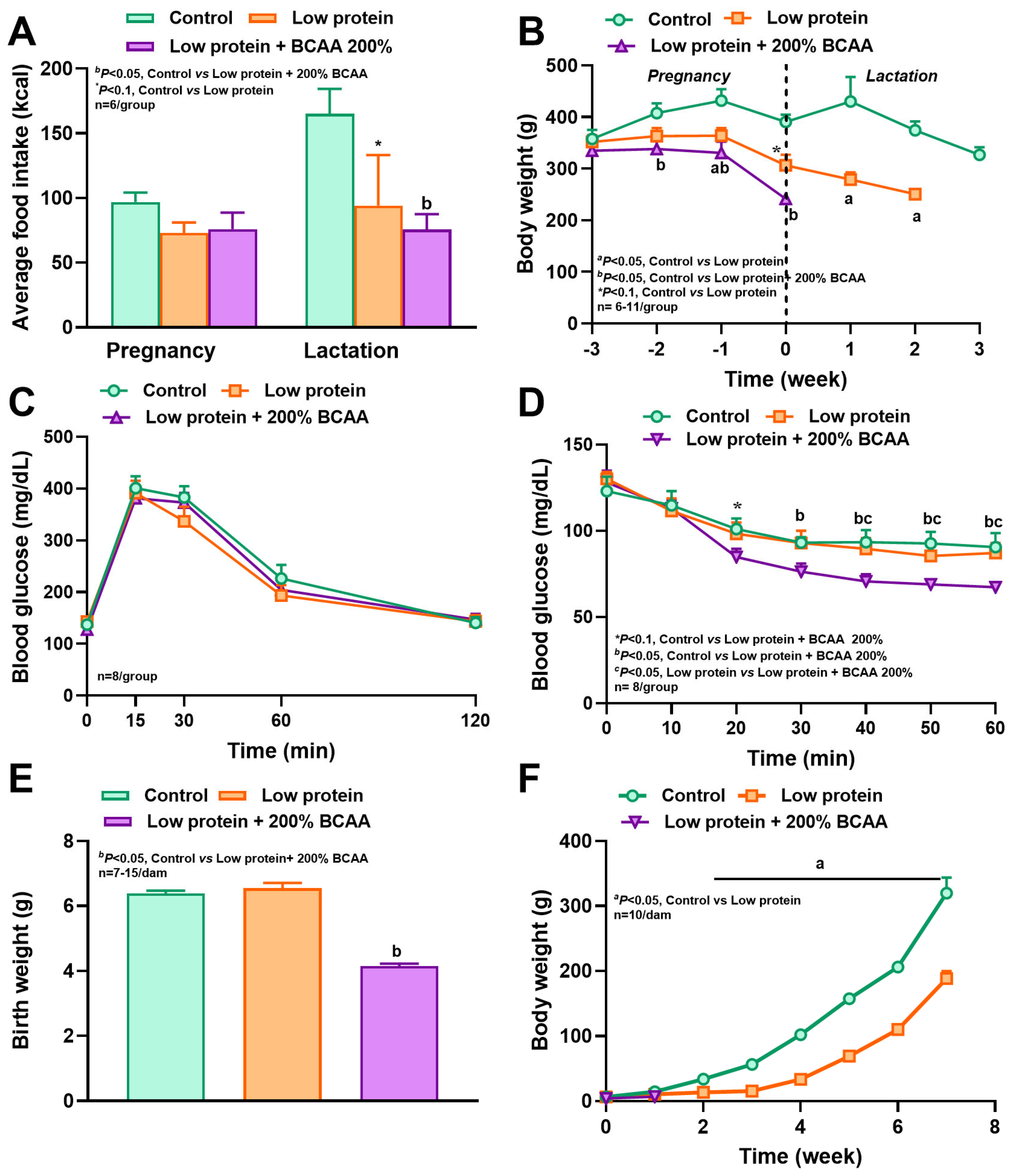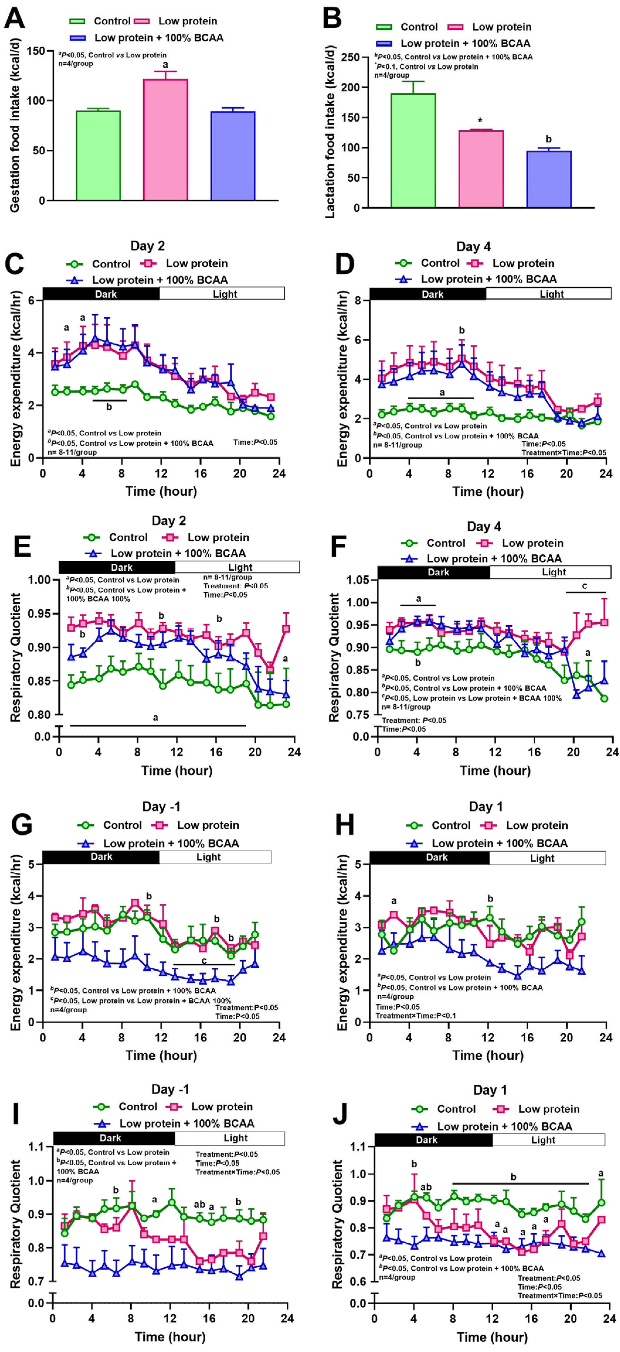 3.1. Maternal Protein Restriction and Branch Amino Acid Supplementation Alter Food Intake, Energy Expenditure, and Respiratory Quotient During Pregnancy and Lactation