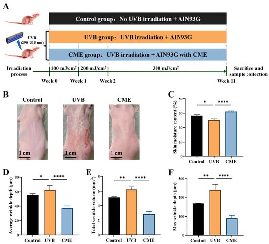 The standard AIN93G diet was administered to mice in the Control and UVB groups, whereas the CME group was provided with AIN93G containing 0.5% (w/w) CME (detailed diet composition in Table S1). Throughout the experiment, mice had free access to food and drinking water. Dorsal skin was photographed at regular intervals. At the end of the experimental period, fecal samples were collected in the morning and frozen at −80 °C for further analysis. After a 6-h fast (from 8:00 a.m. to 2:00 p.m.), mice were anesthetized with isoflurane, followed by the replication of skin wrinkles. The mice were subsequently euthanized by cervical dislocation in accordance with ethical guidelines, and dorsal skin tissues were collected for further analysis. One portion of the samples was stored at −80 °C, while the remaining samples were fixed in paraformaldehyde for subsequent processing.