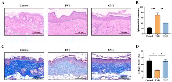 Increased epidermal thickness is a typical histopathological manifestation of skin photoaging [36]. Histopathological examination of skin sections stained with H&E revealed that UVB exposure significantly induced epidermal hyperplasia, whereas dietary supplementation with CME effectively attenuated this pathological thickening (Figure 2A,B). Furthermore, UVB irradiation induces collagen loss in the skin. Masson staining of dermal tissues demonstrated a marked reduction in collagen fiber density following prolonged UVB irradiation (Figure 2C,D). In contrast, dietary CME supplementation significantly restored collagen fiber density in photoaged skin relative to the UVB group (Figure 2C,D).
