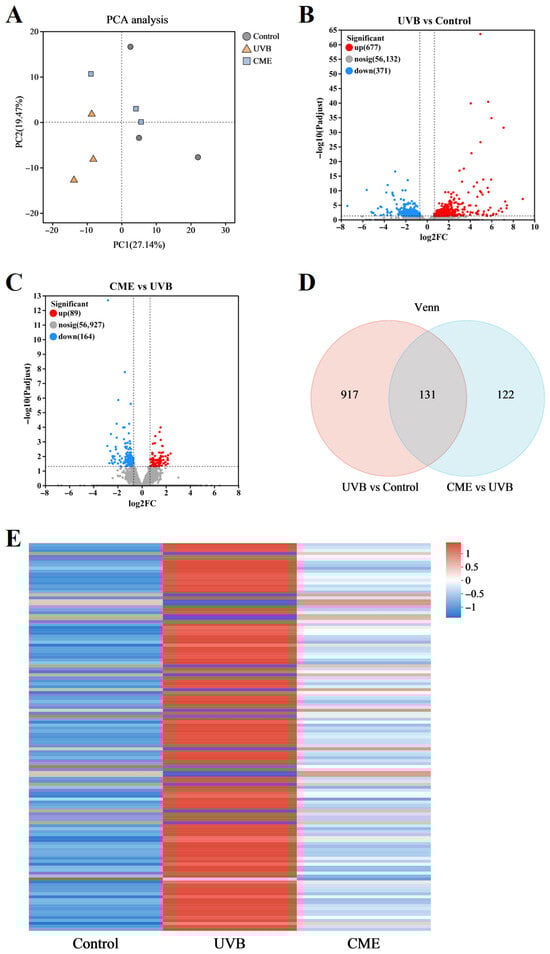 Dietary CME alters skin gene expression patterns. (A) PCA of the skin transcriptome. (B) Volcano plot of the DEGs in the UVB group mice compared with the Control group mice. (C) Volcano plot of the DEGs in the CME group mice compared with the UVB group mice. (D) Venn analysis. (E) The heatmap of 131 overlapped DEGs. n = 3.