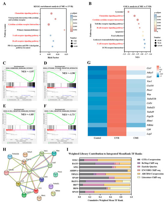 Skin transcriptome enrichment analysis, PPI network analysis, and TF enrichment analysis of the DEGs on key pathways. (A) KEGG enrichment analysis of DEGs (CME vs. UVB, p-adjust < 0.05). (B) GSEA of all genes (CME vs. UVB, p-adjust < 0.05). Overlapping pathways are indicated in red font. (C) Chemokine signaling pathway enriched by GSEA. (D) Cytokine–cytokine receptor interaction enriched by GSEA. (E) B cell receptor signaling pathway enriched by GSEA. (F) T cell receptor signaling pathway enriched by GSEA. NES, normalized enrichment score. (G) Expression heatmap of DEGs associated with the four key signaling pathways among the Control, UVB, and CME groups. (H) PPI network of DEGs from the four key pathways. Edge thickness indicates the strength of interaction support. (I) Top 10 TFs predicted by ChEA3. n = 3.