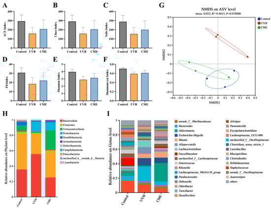 Fecal DNA from the Control, UVB, and CME groups (n = 3 per group) was extracted using a fecal DNA isolation kit (Beijing Fudean Technology Co., Ltd., Beijing, China) and evaluated with a NanoDrop 2000 spectrophotometer (Thermo Fisher Scientific Inc., Waltham, MA, USA). PCR amplification targeted the V3–V4 regions of the bacterial 16S rRNA gene with primers 338F (5′-ACTCCTACGGGAGGCAGCAG-3′) and 806R (5′-GGACTACHVGGGTWTCTAAT-3′). PCR conditions included an initial denaturation at 95 °C for 3 min, 27 cycles of 95 °C for 30 s, 55 °C for 30 s, and 72 °C for 45 s, and a 10 min final extension at 72 °C, followed by holding at 10 °C (T100 Thermal Cycler PCR thermocycler, BIO-RAD Laboratories Inc., Hercules, CA, USA). Amplicons were subsequently purified, quantified, combined in equimolar amounts, and sequenced in paired-end mode on the Illumina NextSeq 2000 platform (Illumina Inc., San Diego, CA, USA).