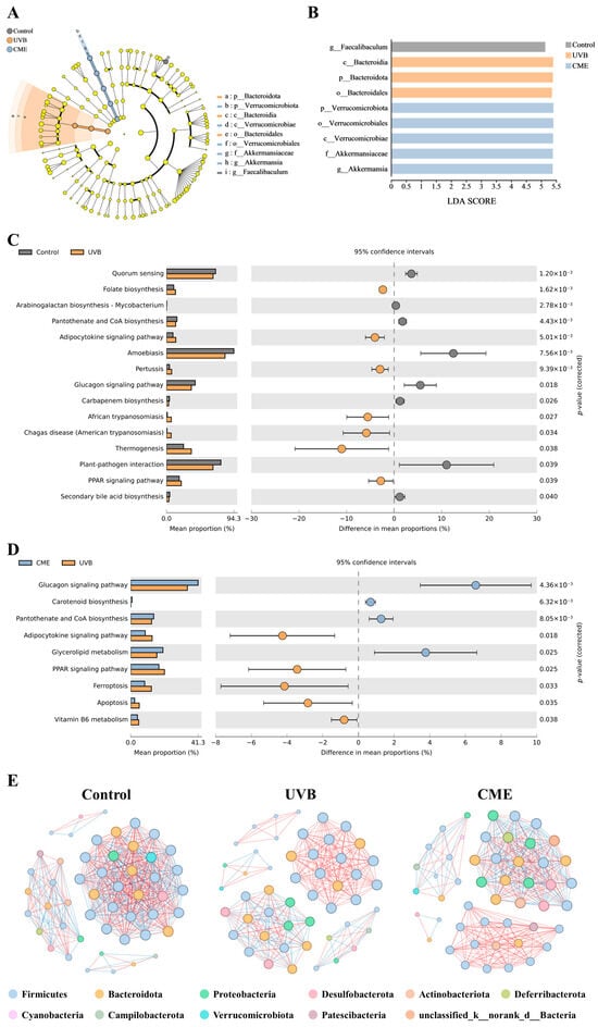 Analyses of differentially abundant bacteria, functional prediction, and co-occurrence network in gut microbiota of photoaged mice after dietary supplementation with CME. (A) LEfSe analysis across taxonomic levels (from outer to inner rings: genus, family, order, class, and phylum). (B) LDA scores for the bacterial taxa. (C) Predicted KEGG functional pathways (Control vs. UVB). (D) Predicted KEGG functional pathways (UVB vs. CME). Statistical significance (p < 0.05) was assessed by two-tailed Welch’s t-test in STAMP. (E) Co-occurrence network for three groups. Edges represent significant Spearman correlations between genera (|r| > 0.6, p < 0.05). Negative correlations are shown in blue, while positive correlations are shown in red. Node size reflects connectivity, and node color indicates phylum affiliation. n = 3.