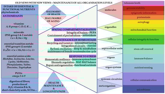 There remains a critical need for enhanced awareness among researchers, clinicians, and public health stakeholders regarding the growing body of evidence linking micronutrient status to molecular and physiological resilience. When health is viewed solely through overarching frameworks such as the hallmarks of health, aging paradigms, or lifestyle-based models (e.g., “old NEWS”: Nutrition, Exercise, Weight control, Sleep, and Social interaction versus Stress), molecular and biochemical perspectives are often insufficiently integrated. In particular, mutual synergy even of ions and small molecules—central components of signaling pathways, enzymatic systems, and metabolic networks—are frequently overlooked in interactome-based analyses [8,15,16,17].