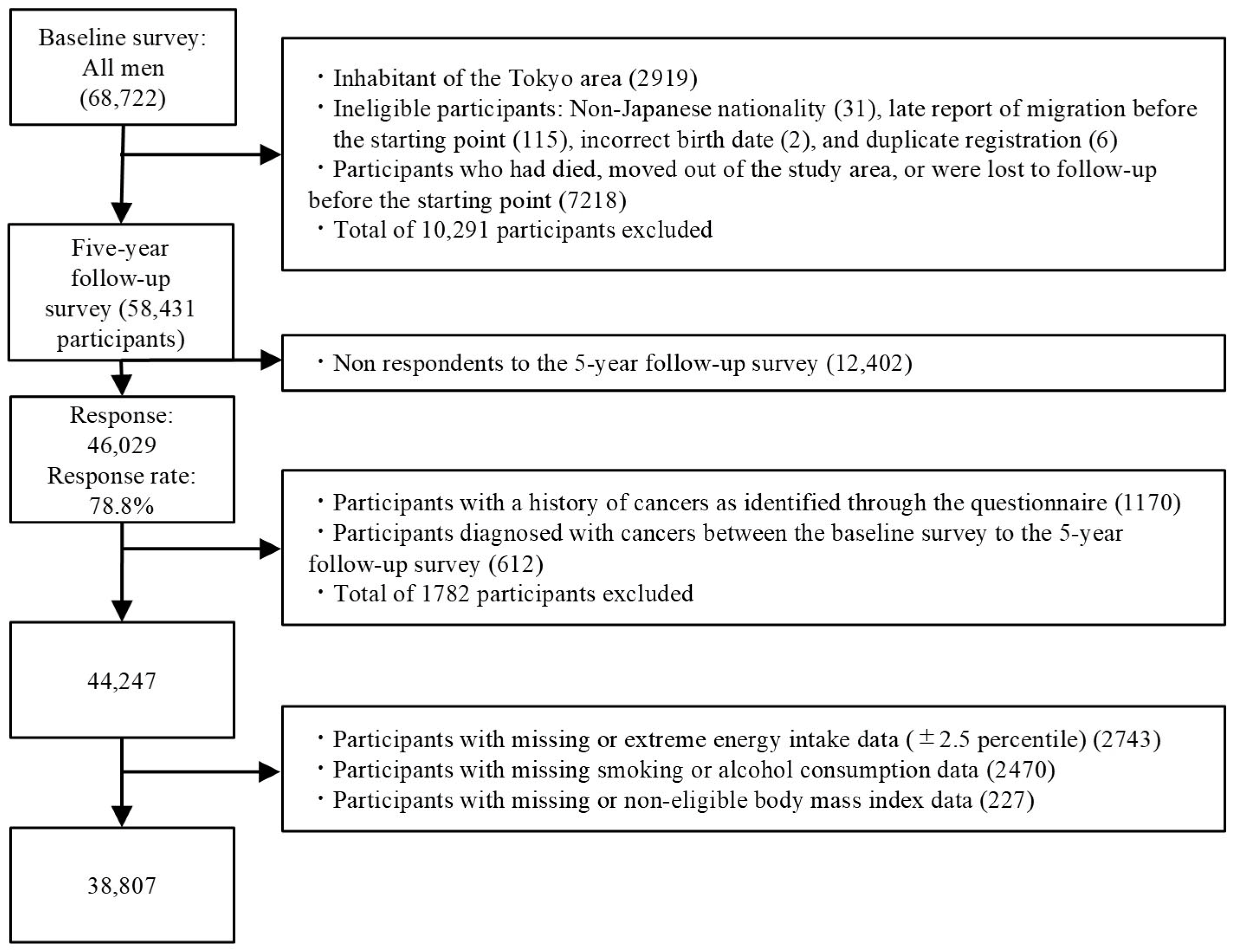 - Hara, M.; Sasaki, S.; Sobue, T.; Yamamoto, S.; Tsugane, S. Comparison of cause-specific mortality between respondents and nonrespondents in a population-based prospective study: Ten-year follow-up of JPHC study cohort I. Japan public health center. J. Clin. Epidemiol. 2002, 55, 150–156. [Google Scholar] [CrossRef]