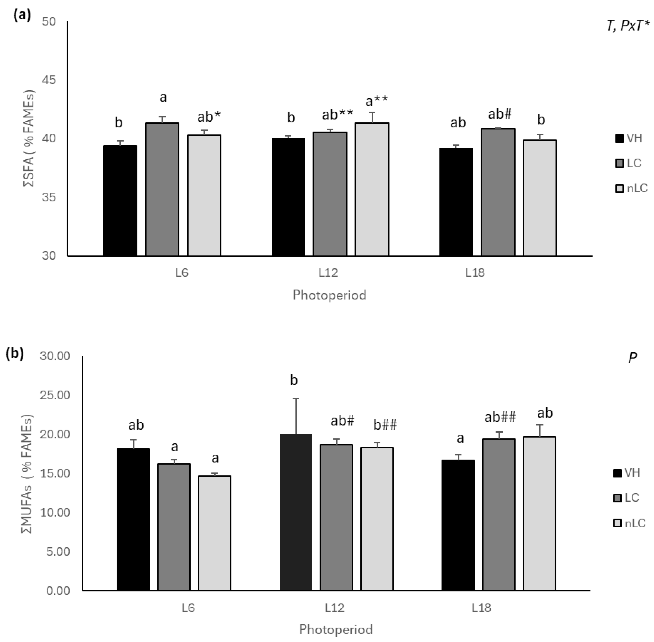 | Σ PUFAs n-3 | 12.46 ± 1.10 a | 13.02 ± 0.82 a | 14.38 ± 0.32 a | 11.14 ± 1.70 b | 12.47 ± 0.45 a | 10.82 ± 1.53 b | 13.73 ± 0.46 a | 11.55 ± 0.49 ab# | 12.04 ± 0.52 ab | P, PxT |