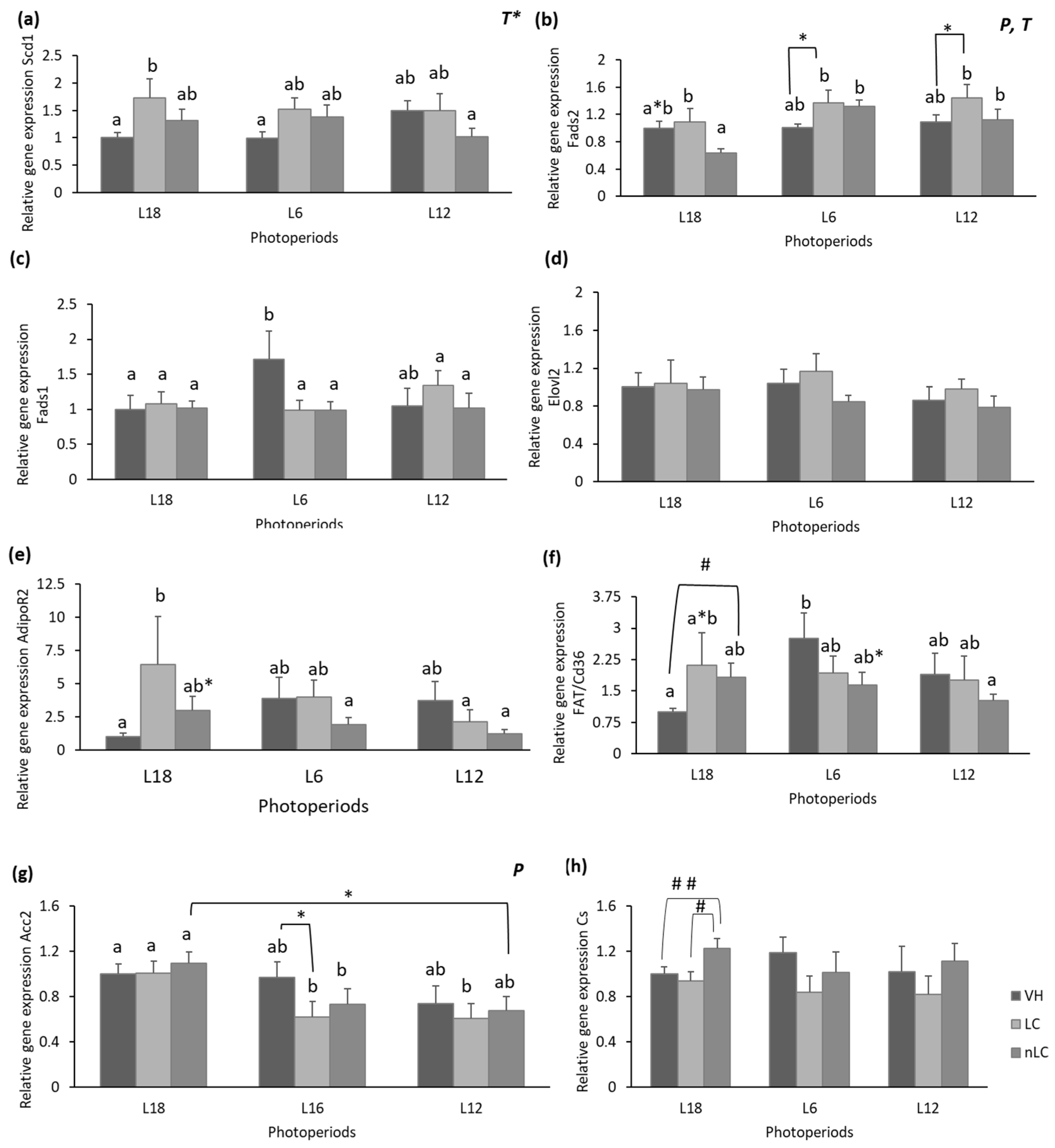 3.6. Consumption of LC in Season Increased the Gene Expression of Hepatic Scd1 and Muscle AdipoR2 Levels