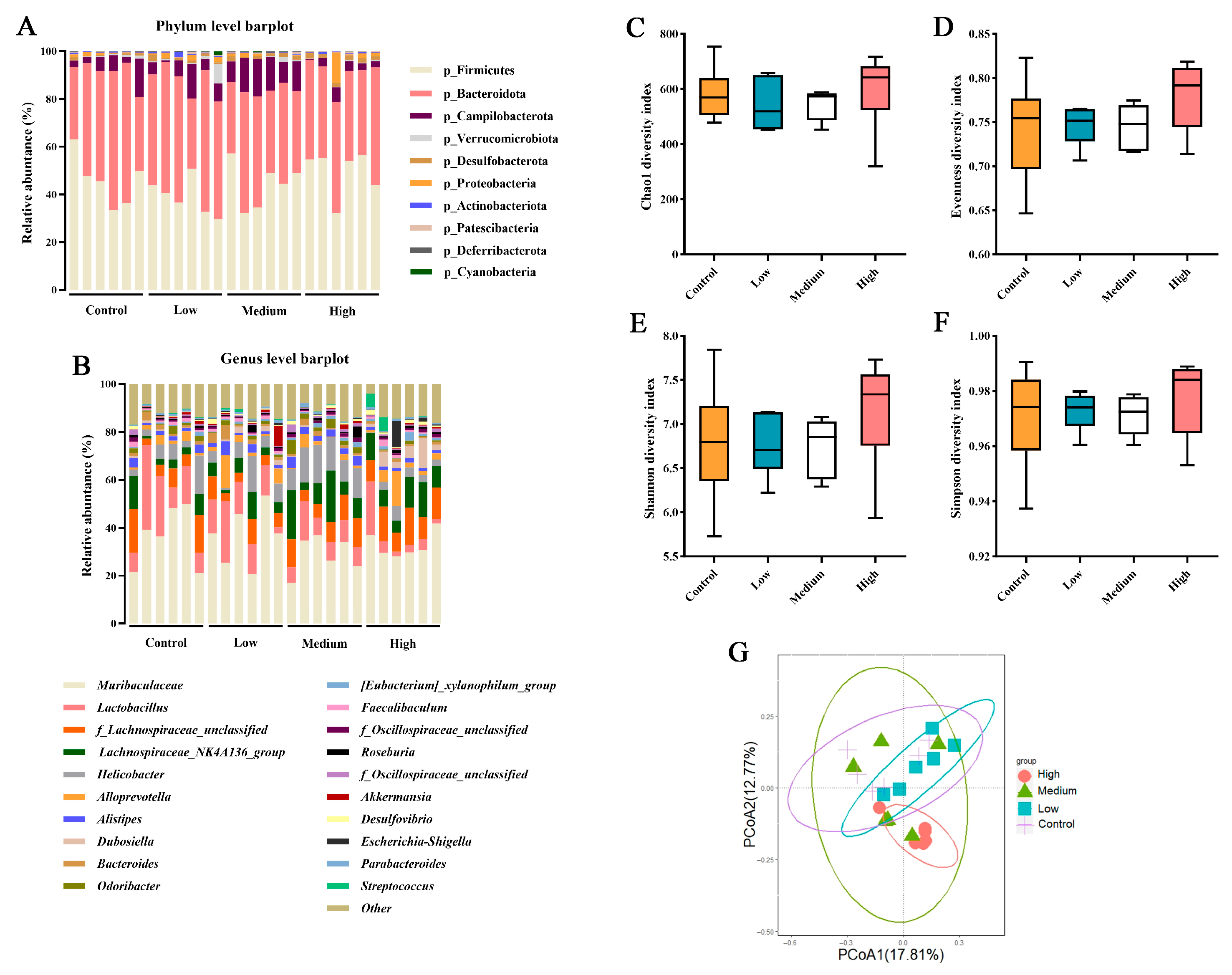In this study, the dominant phyla and genera in the cecal microbiota of mice across all treatment groups exhibited similar compositions (Figure 4A,B). Administration of BCFAs-DFL at various doses did not induce significant alterations in α-diversity indices of the gut microbiota (p > 0.050; Figure 4C–F). Beta diversity analysis revealed high similarity among the control, low-, and medium-dose groups, with the high-dose group showing partial overlap with the medium-dose group (Figure 4G). For the differential abundance analysis, only taxa with a relative abundance above 0.05% at the genus level were included. The relative abundance of a total of 21 bacterial genera was significantly affected by the treatment (p ≤ 0.050; Table 7). No significant differences were observed between the low-dose and control groups (p > 0.050). In the medium-dose group, the relative abundance of Faecalibaculum was significantly lower than that in the control group, whereas f_Desulfovibrionaceae_unclassified and Eubacterium_siraeum_group showed the opposite trend (p ≤ 0.05). In the high group, the relative abundances of Dubosiella, Escherichia-Shigella, Streptococcus, f_Desulfovibrionaceae_unclassified, Lachnospiraceae_UCG-006, Oscillospiraceae_UCG-010, and Eubacterium_siraeum_group were significantly higher than those in the control group. Conversely, the relative abundances of Odoribacter, Clostridia_vadinBB60_group, ASF356, Anaeroplasma, and Rikenellaceae were significantly lower than those in the control group (p ≤ 0.05).