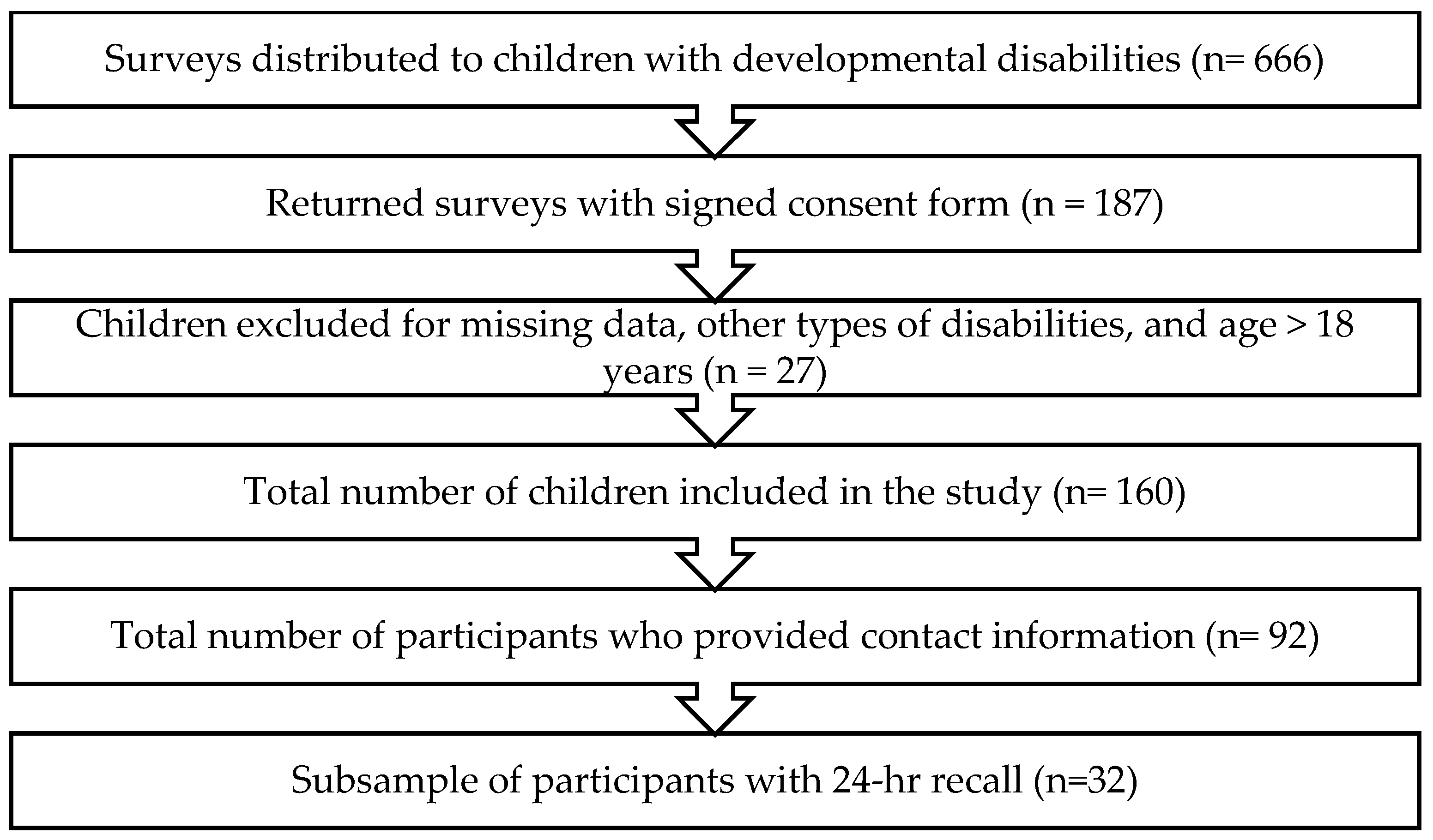 A total of 666 envelopes were distributed to children to take home, each containing the study objectives, inclusion and exclusion criteria, a parental consent form, and a questionnaire. Only children who met the inclusion criteria described in the questionnaire were expected to return the envelopes. Envelopes were collected within two weeks, and caregivers were later contacted to arrange a phone interview to collect the dietary data of the children. The questionnaire requested caregivers to provide personal data (including contact information) as well as information about their child with DD (diagnosed health condition, feeding problems, and dietary quality).