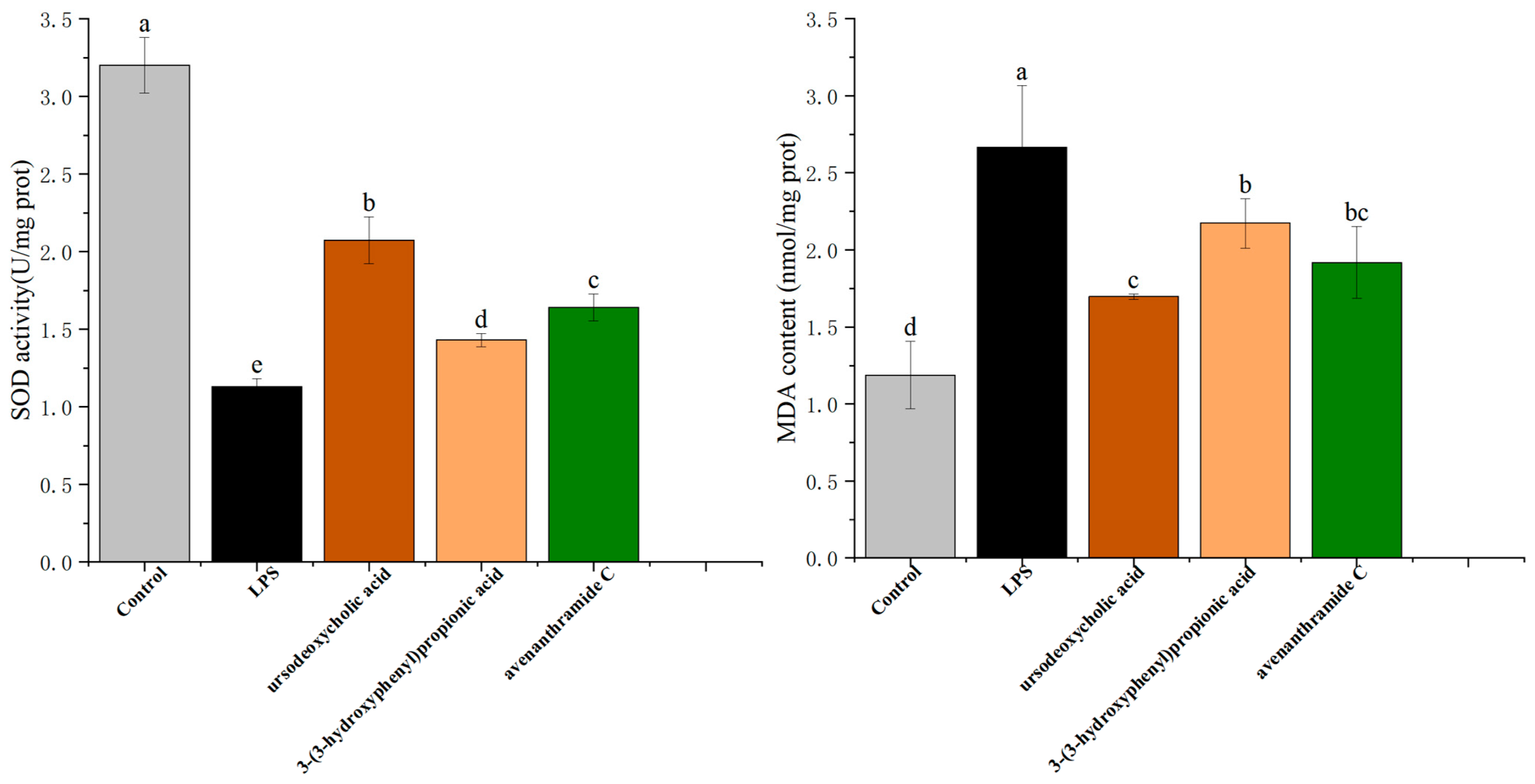 Figure 4. Effects of different concentrations of UDCA, 3-HPP, and AVC on LPS-induced SOD and MDA enzyme activities in RAW264.7 macrophages. Different letters (a, b, c, d and e) indicate significant differences between groups (p < 0.05) as determined by one-way ANOVA.