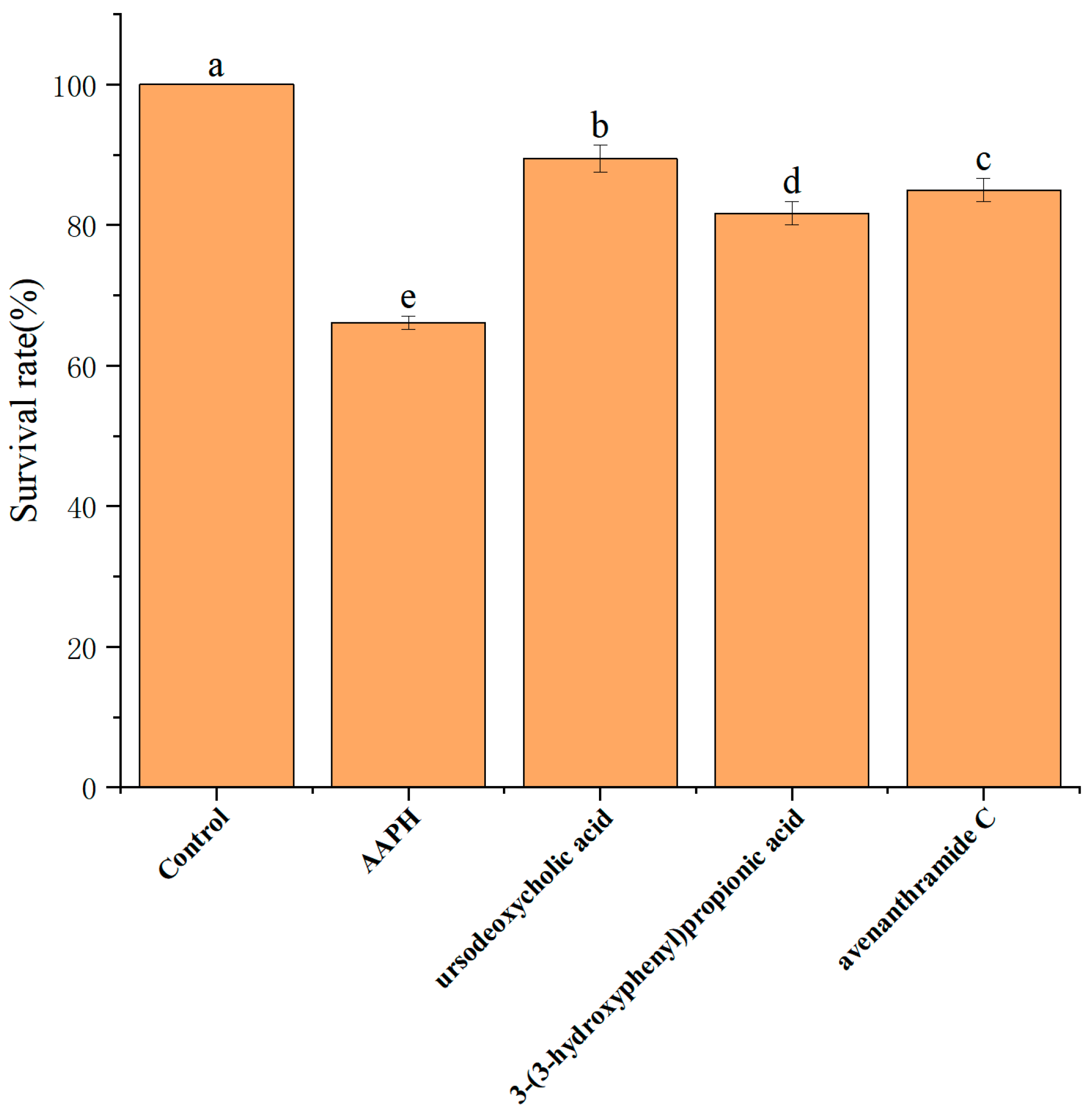 Figure 5. Survival of zebrafish embryos after co-treatment with 25 mM AAPH and three metabolites. Different lowercase letters (a, b, c, d and e) indicate significant differences between groups (n = 15 per group). Different letters (a, b, c) indicate significant differences between groups (p < 0.05) as determined by one-way ANOVA.