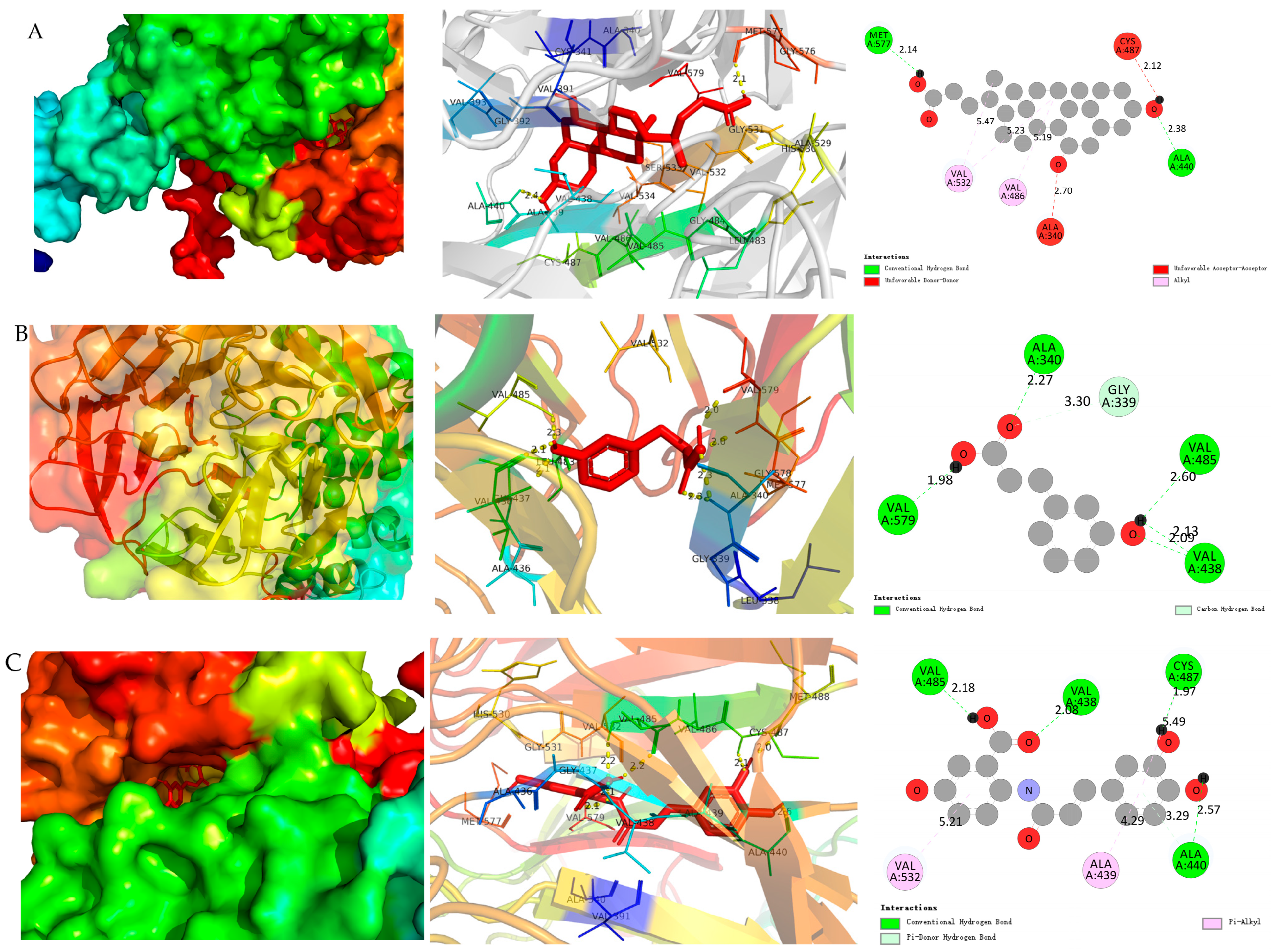 Detailed binding mode analysis revealed that UDCA forms hydrogen bonds with critical residues Met577 and Ala440, and engages in hydrophobic interactions with Val532 and Val486 (Figure 7). Similar interactions were observed for AVC and 3-HPP, albeit with lower binding strengths. These findings are consistent with previous reports showing that certain bile acids and phenolic compounds can activate the Keap1-Nrf2 signaling axis to protect against oxidative stress [35,36].