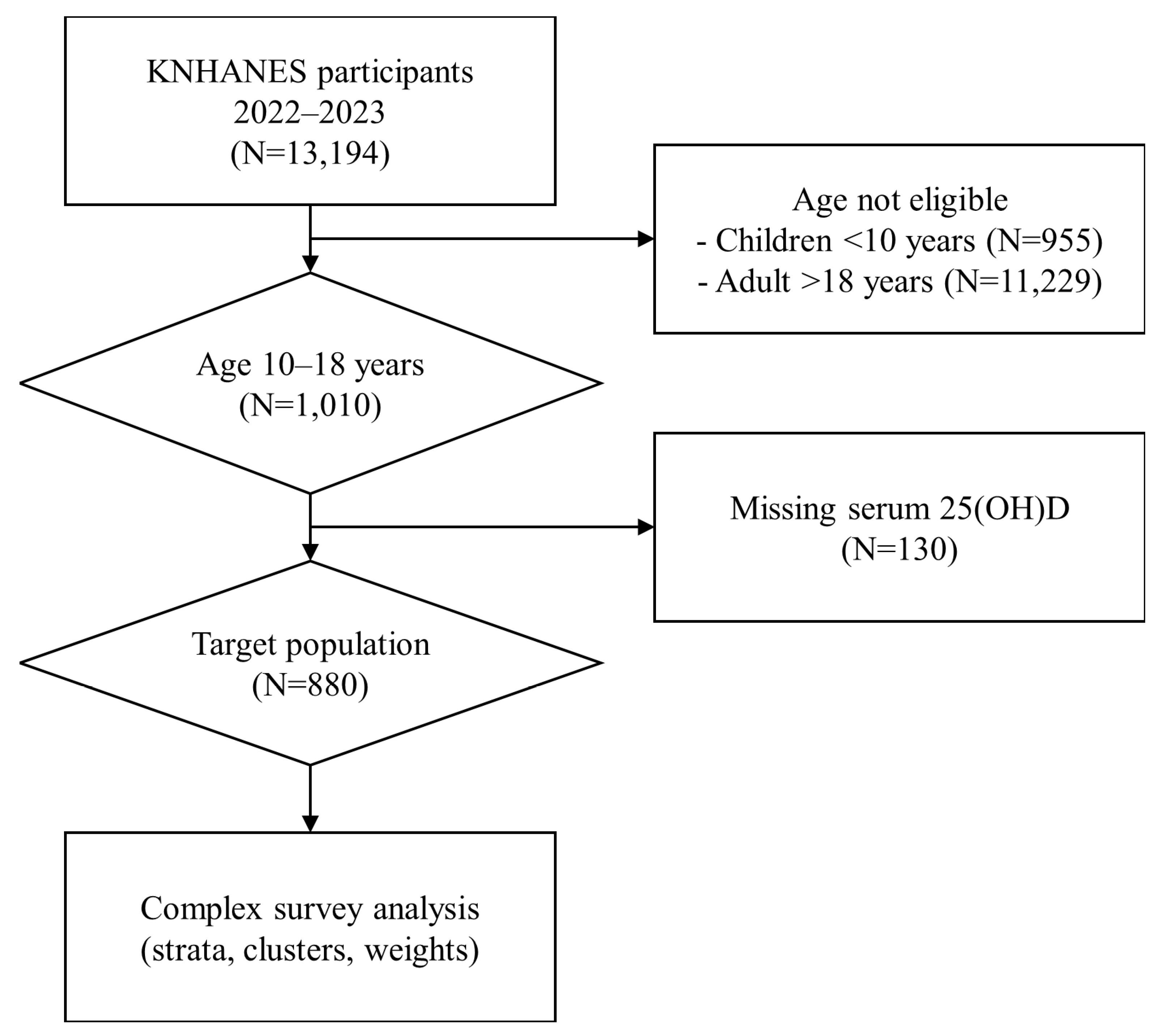 Chicago/Turabian StyleCho, Min Hyung, Young Suk Shim, and Hae Sang Lee. 2026. "Associations Between Serum 25-Hydroxyvitamin D Levels and Metabolic Syndrome Among Korean Adolescents: Based on the Korea National Health and Nutrition Examination Survey in 2022–2023" Nutrients 18, no. 2: 360. https://doi.org/10.3390/nu18020360