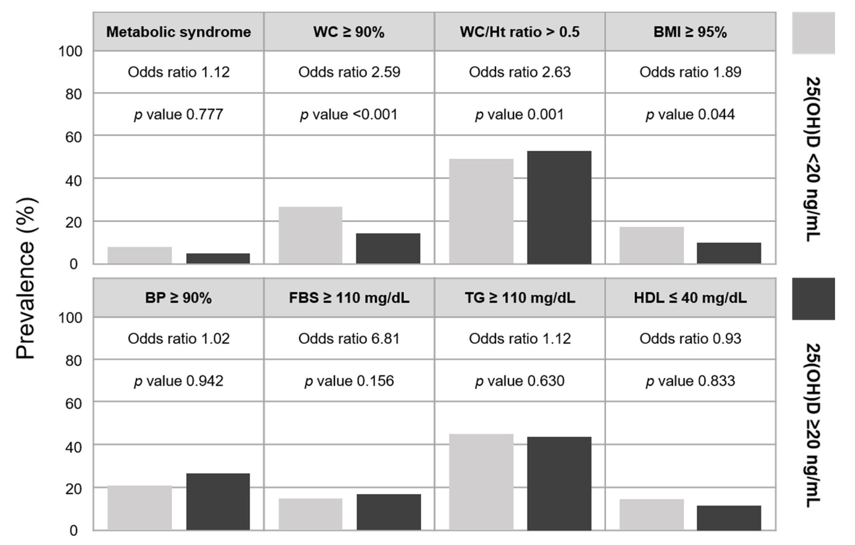 - Lee, D.Y.; Kwon, A.R.; Ahn, J.M.; Kim, Y.J.; Chae, H.W.; Kim, D.H.; Kim, H.S. Relationship between serum 25-hydroxyvitamin D concentration and risks of metabolic syndrome in children and adolescents from Korean National Health and Nutrition Examination survey 2008–2010. Ann. Pediatr. Endocrinol. Metab. 2015, 20, 46–52. [Google Scholar] [CrossRef] [PubMed]