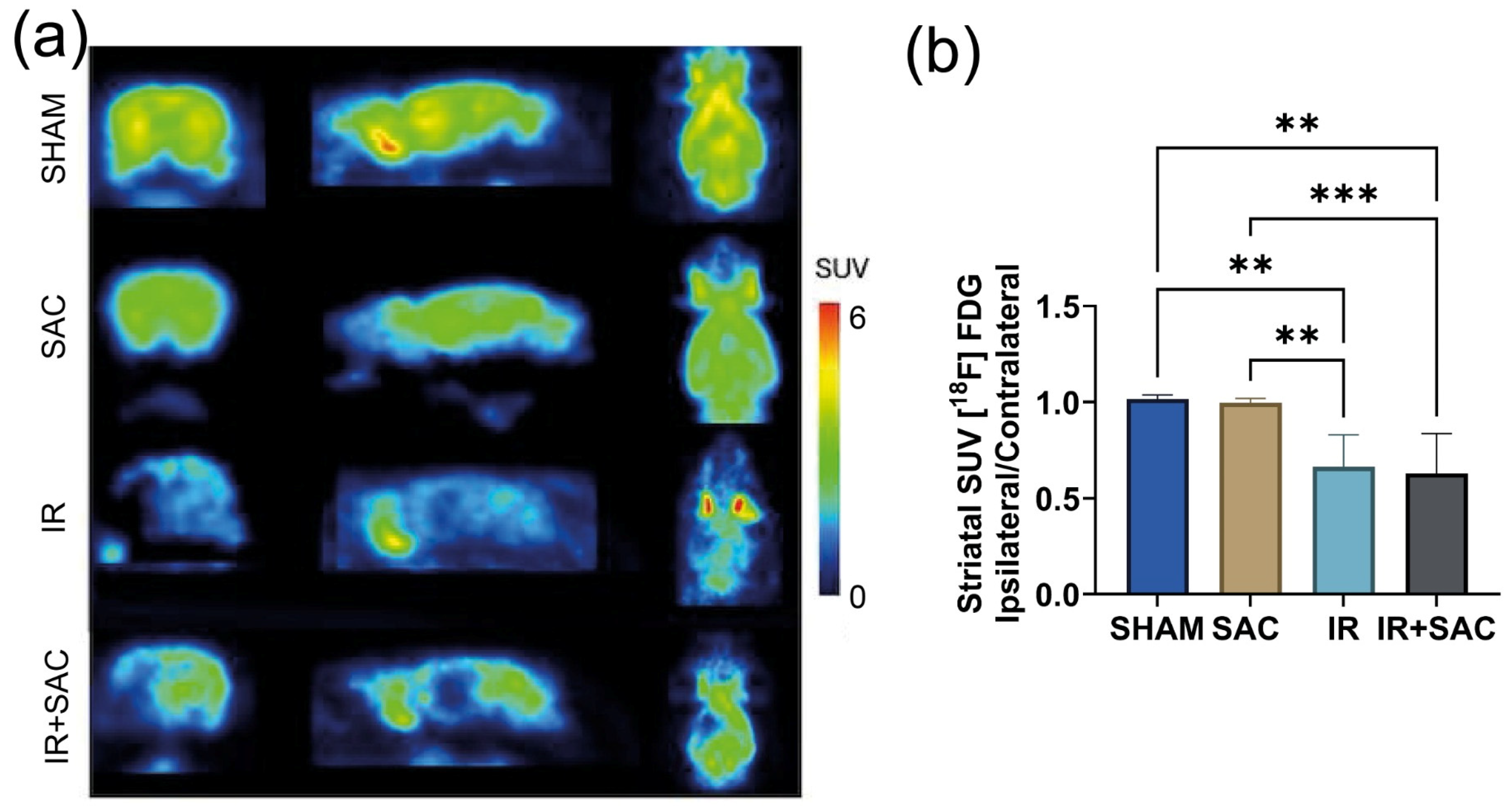 3.2. SAC Reduces Infarct Area, Motor Deficit, and Circling Behavior