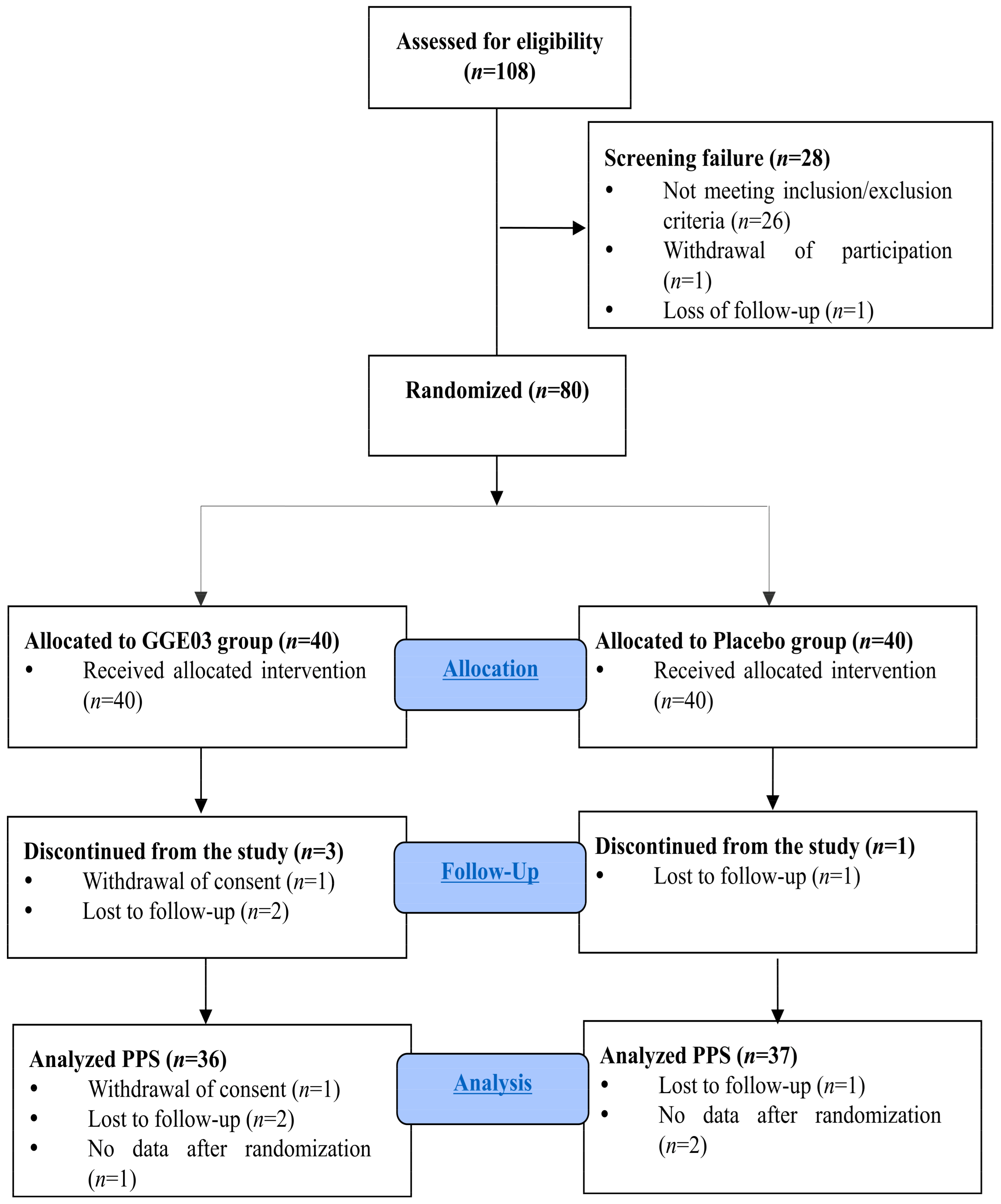 | Characteristics | GGE03 Group (n = 36) | Placebo Group (n = 37) | p-Value 1 (Between Group) |