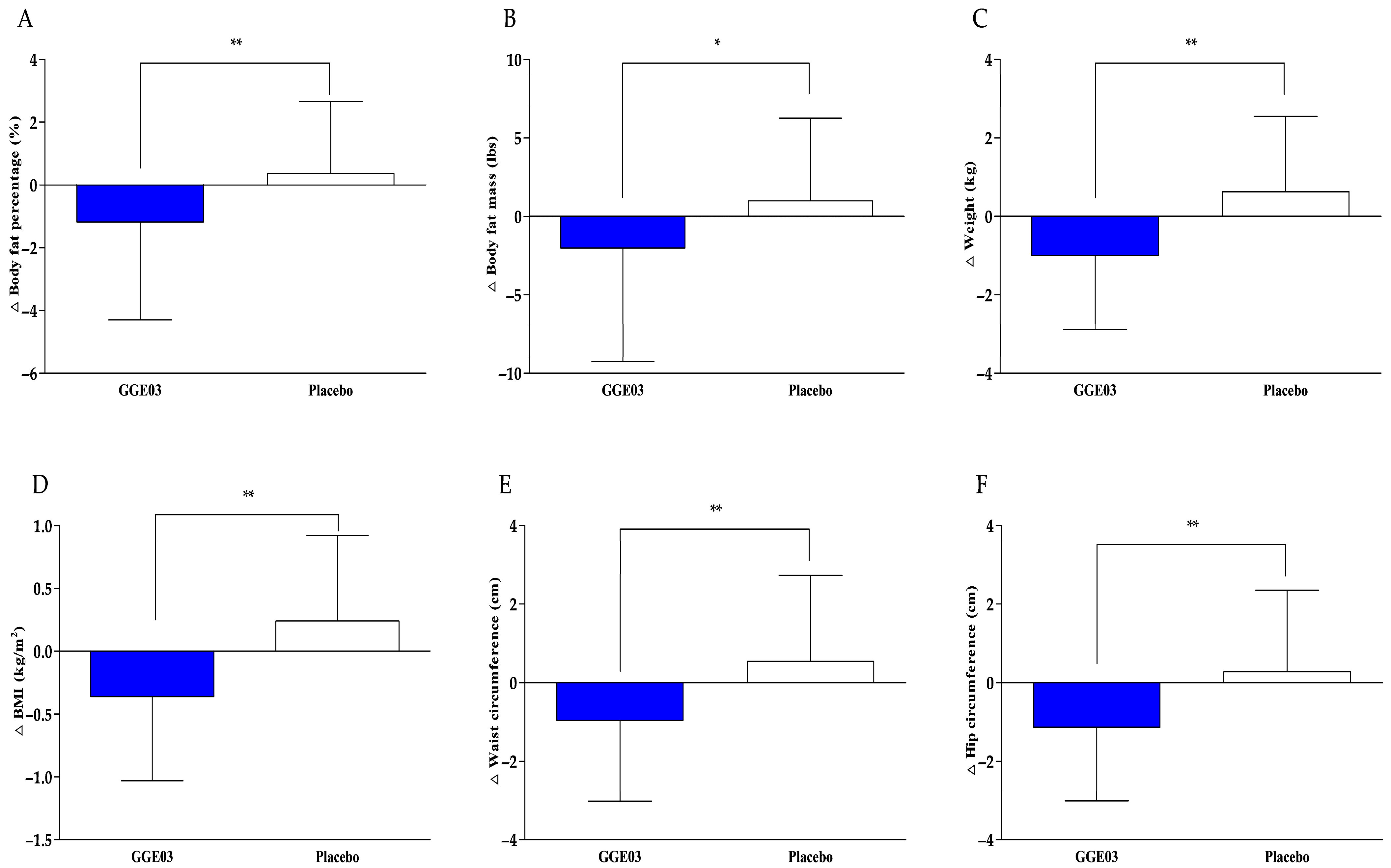 | GGE03 Group (n = 36) | Placebo Group (n = 37) | p-Value 3 (Between Group) | ||||||||